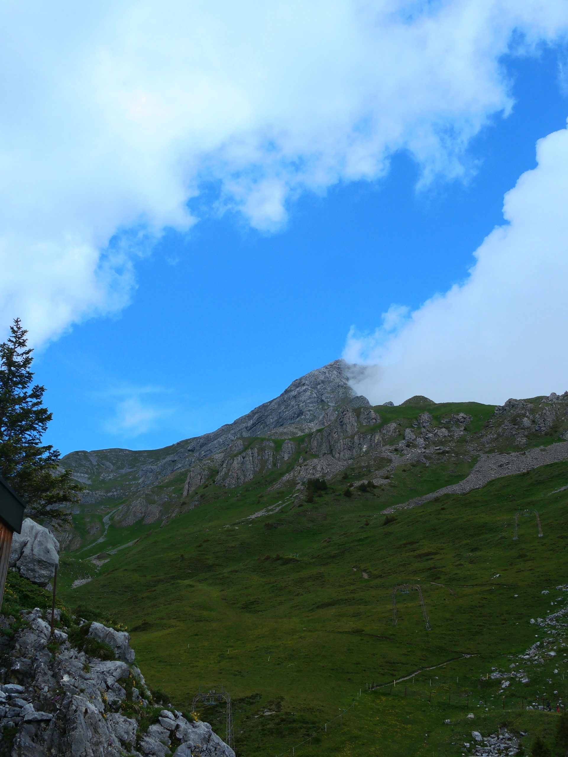 The path from Brunnihütte eases gently upwards, ending about five kilometres and 440 vertical metres later at Rugghubelhütte. Clouds are drifting past, down to about about the 2000m level. Leaving no trace of Titlis, or any of the other higher summits. Apart from occasional glimpses of the Hahnen, the interesting looking peak that I’ve been eyeing since the first visit to Engelberg, our view is restricted to valleys and lower peaks…