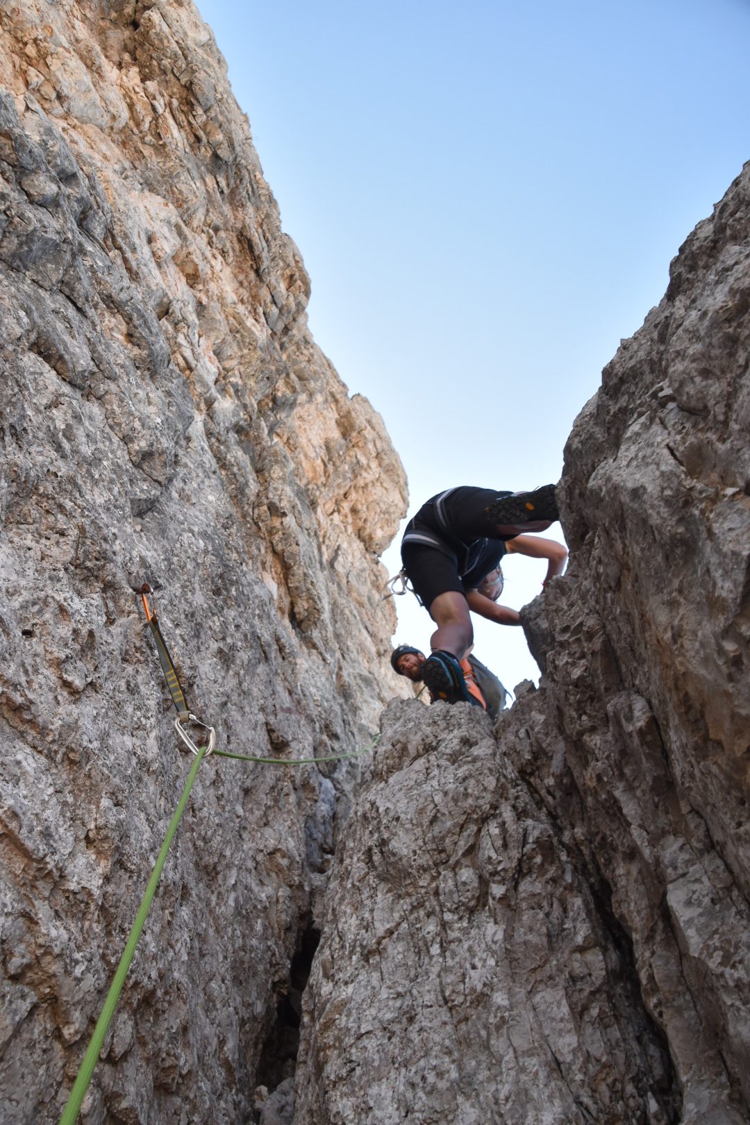We tie into the belay anchor while Alessandro sorts out the ropes. Then he’s off climbing the first relatively easy pitch. When he’s safe on the belay stance we start climbing. First Barbara then I. From the top of this first pitch we climb on a short rope together until we reach the crux pitch. Again we tie into the belay anchor, and wait for Alessandro to lead the crux chimney pitch. Despite Barbara not having any experience climbing chimneys, which requires a push-pull or straddling technique, she makes it to the top relatively easily. Then it’s my turn. I’m climbing with a pack, which makes getting into a comfortable position to make the crux move a little harder. But once I get myself into a balanced position it’s a single quick move to get out of the chimney and onto the tower from where it’s easy to get to the top.