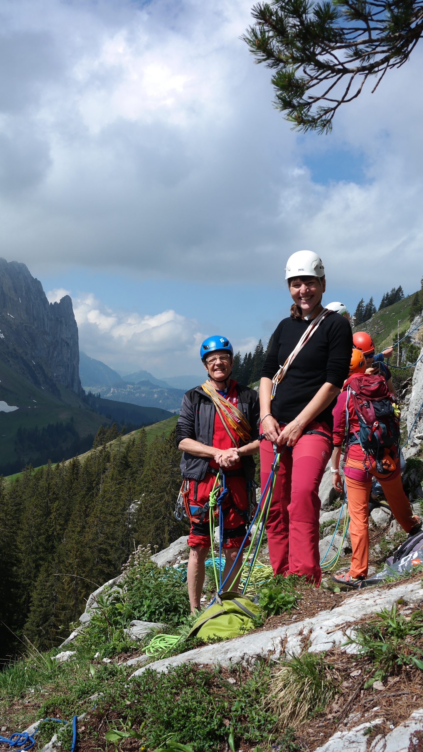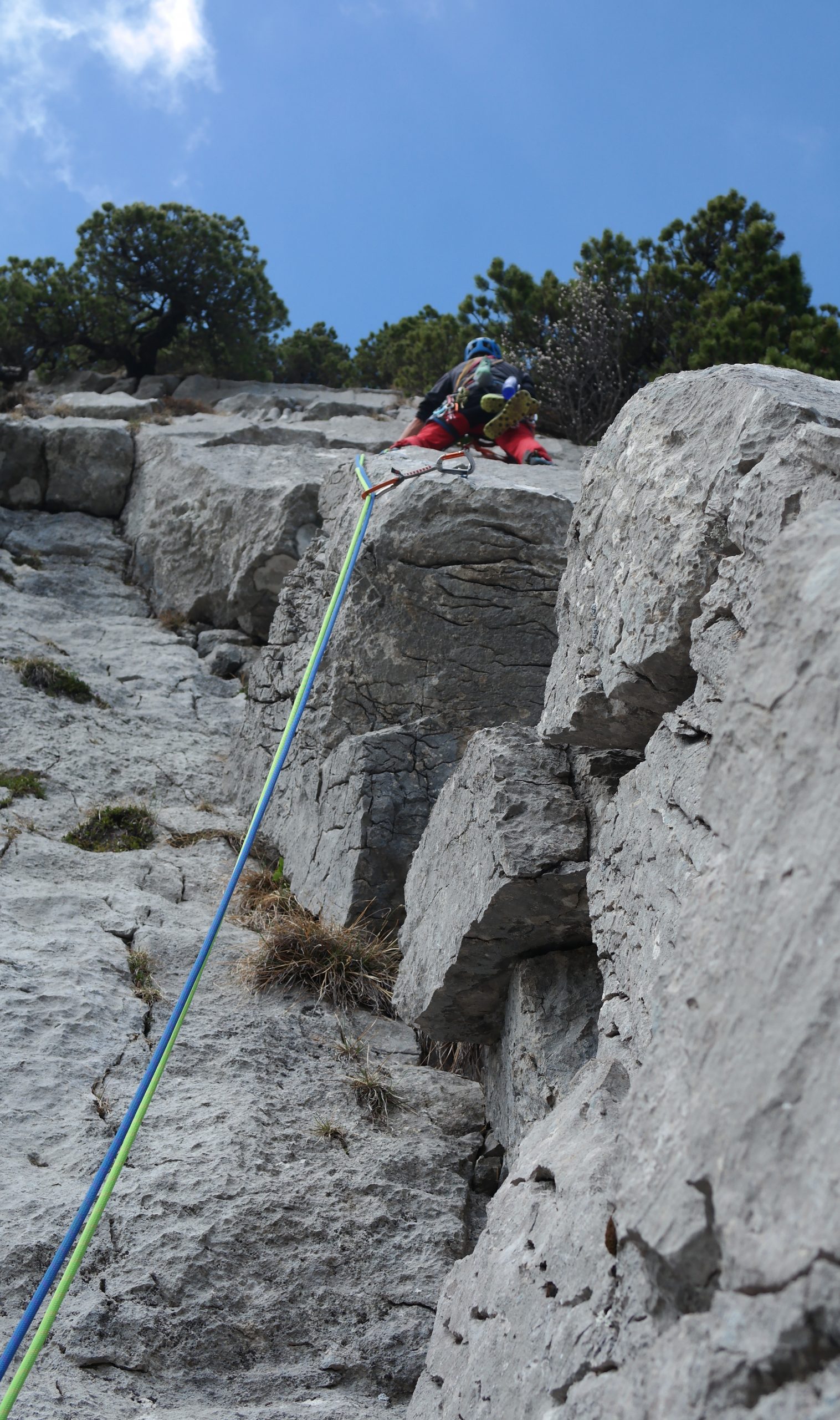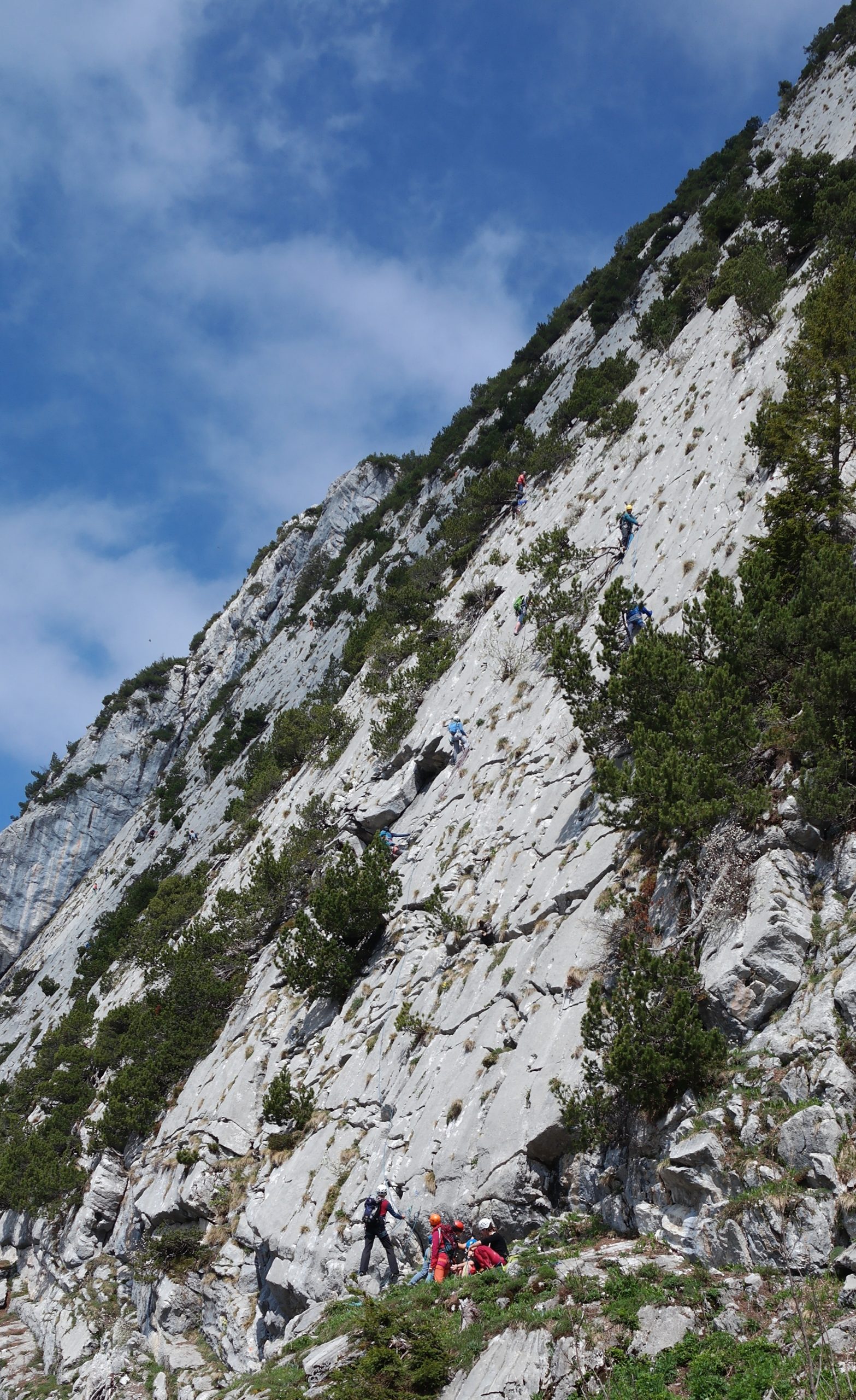 Given that last weekend we had quite a bit of snow at the same altitude as the climbing area, I half expected it to be on the colder side. The snow however had completely gone from the south facing rockface. Somewhat fortunate for us, clouds hung over the area, making for a very pleasant outing on a superb piece of rock offering a variety of climbing routes, ranging up to 150m in length, and with grades from 3+ upwards to the 7s.