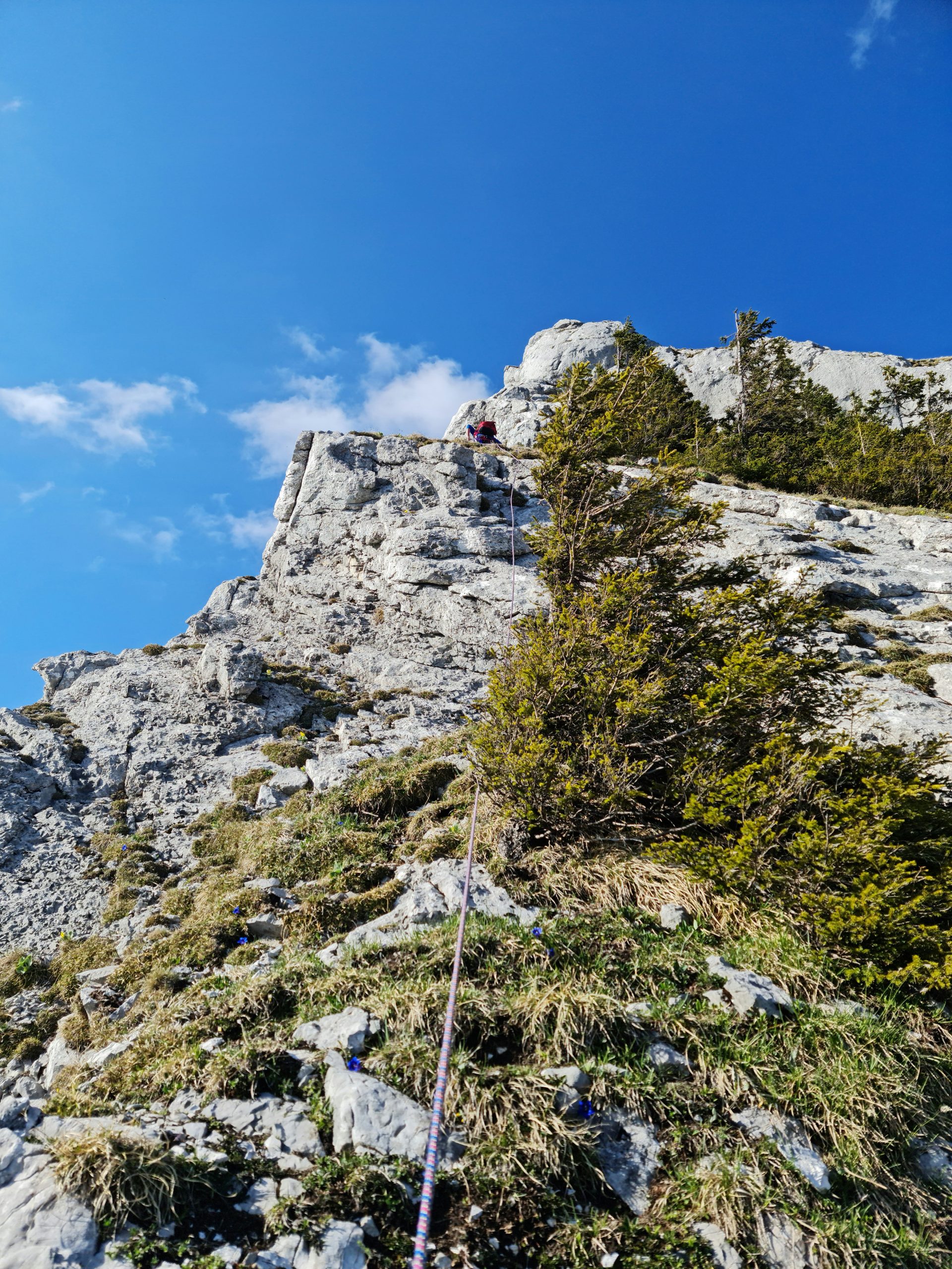 And then we get to the final 11th pitch. A thin diagonal crack leads upwards to the right below a steep wall. Bert sets off leading this one and I follow shortly after. It turns out to be easier than it looks from the bottom. A short scramble on a grass slope brings us to the top of Chöpfenberg.