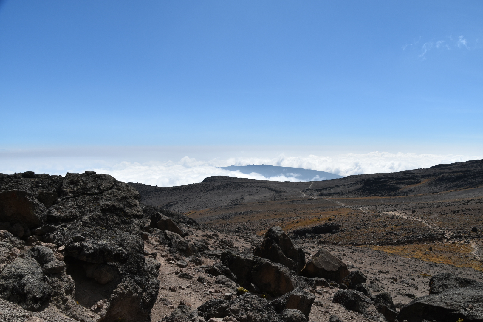 As you exit the forest you enter the heather and moorland zones, which continues up to 4000m. This is where you will see the giant groundsels (Dendrosenecio kilimanjari) which can grow up to 10m high, as well as all ‘sewejaartjies’ or ‘everlastings’ (Helichrysum species), and colourful wild grasses. Also, numerous birds of the grasslands. While daytime temperatures can easily be above 40°C, nighttime temperatures will drop well below zero. The views from here across the clouds below can be totally breathtaking!