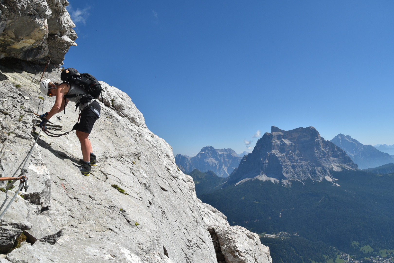The via Normale, a grade II (UIAA) climbing route, partly equipped with fixed cables, can be used to reach the summit of Monte Civetta. It is also commonly used to descend from the summit or the hut after either ascending the mountain via ferratas Alleghesi or Tissi. It’s not in the ‘difficult’ category, but… for more than 750 vertical metres you’re negotiating all kinds of challenges on steep, loose and sometimes unsecured terrain! And you are down-climbing! With its own physical as well as psychological issues…