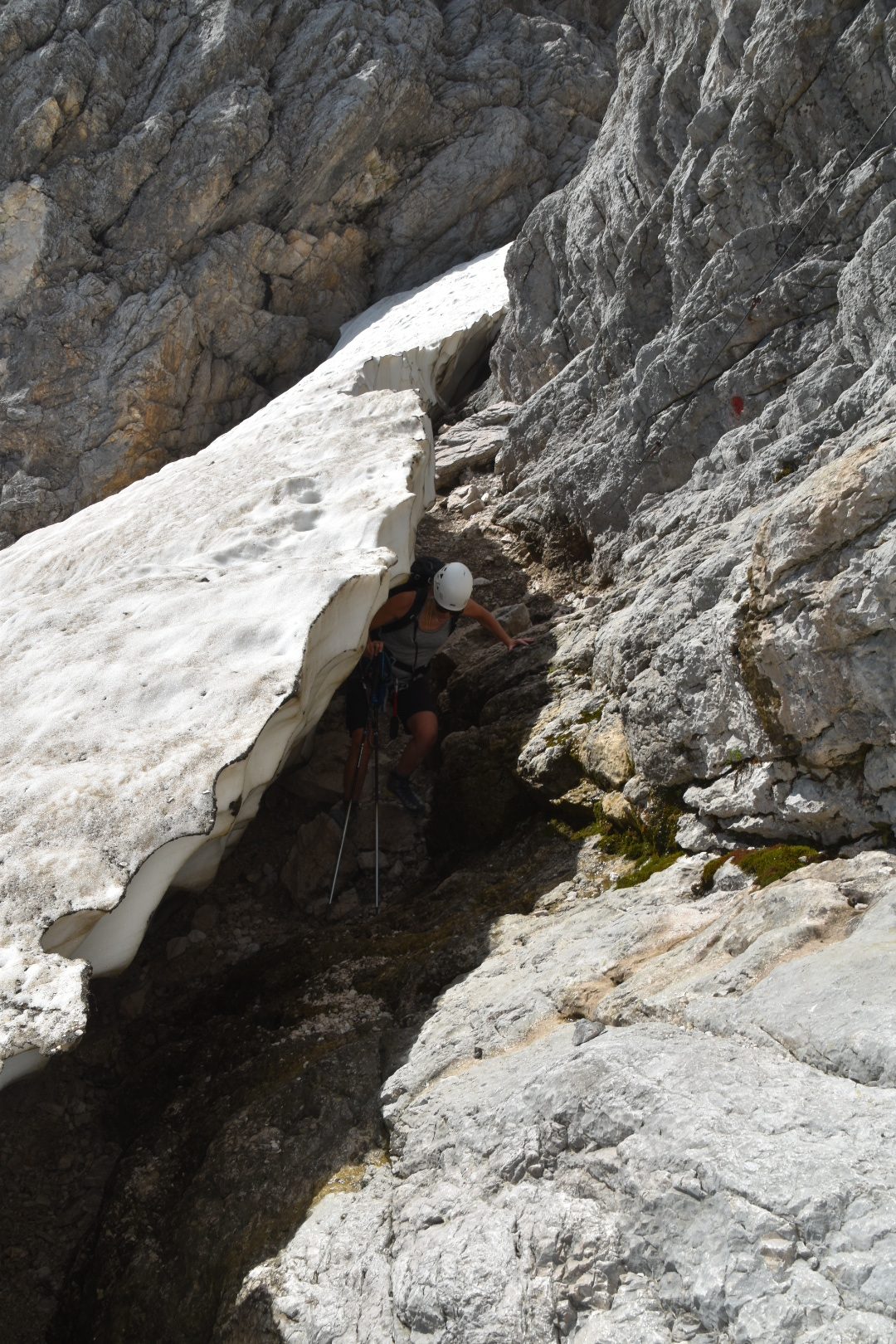 To add to the ‘fun’ the remains of the snowfield at the base of the route has melted away from the rock, so we have to make our way underneath it for about 10 metres, before scrambling back onto the rock, stepping over a gap onto what looks like a super thin edge that could break off at any minute, then crossing the snow to meet up with the scree slope diagonally across for the final part of the descent. From here we have to pick our way through the rubble and debris that makes up the scree field, before we finally reach the contour path and make our way back via Rifugio Coldai to Palafavera where we had parked the car.