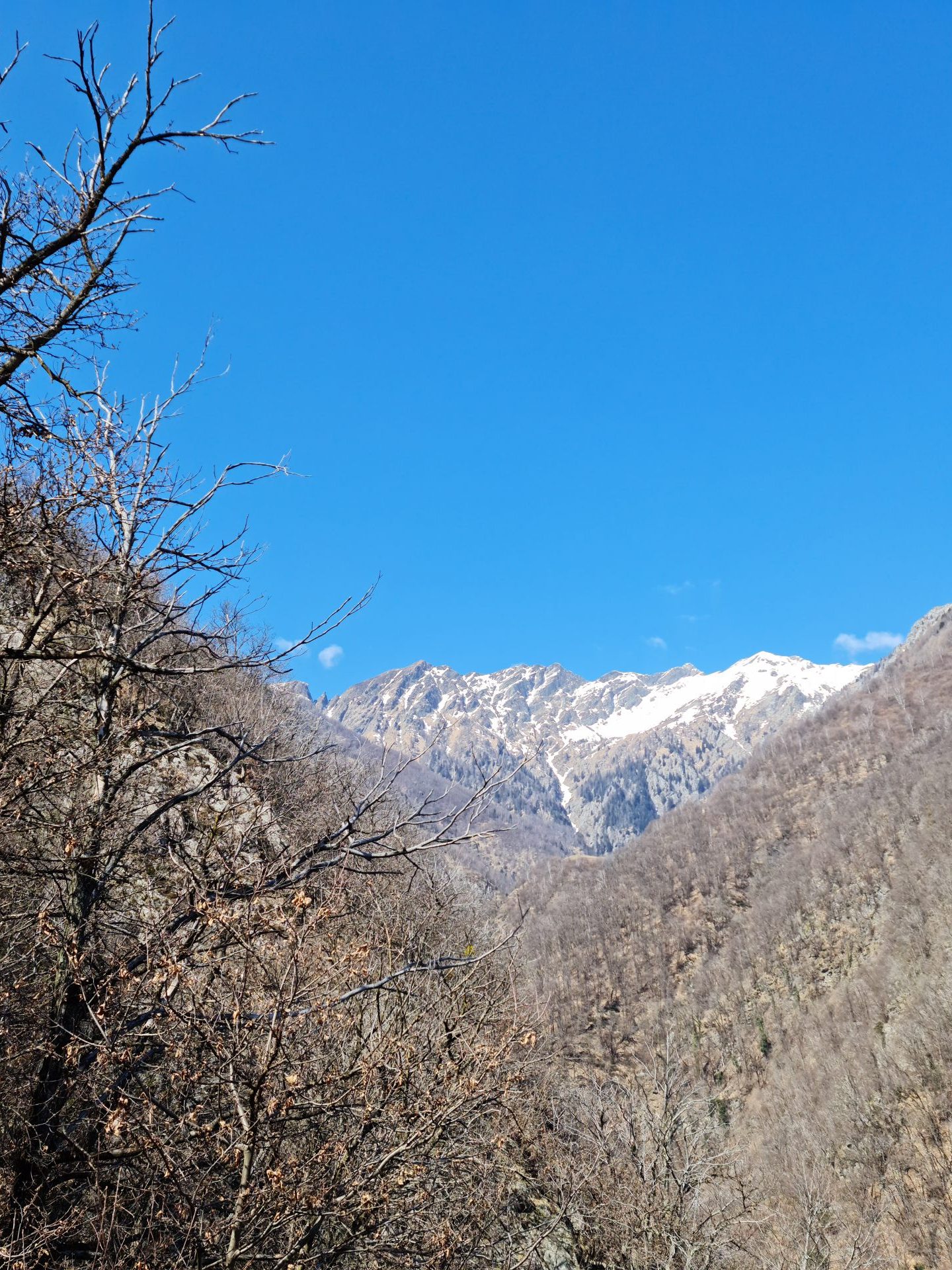 As we climbed higher, the gorge next to us appeared to be getting deeper. Forming a perfect backdrop to the barren-looking trees, devoid of leaves and looking desperately dry, were the white-cladded peaks of the Alps above Sementina. Higher up we catch our first glimpses of the ponte Tibetano – suspended across the river. Even from a distance, and seeing only part of it, it looks spectacular. A short while later, we start dropping down towards the river, and before long we’re looking at the ponte Tibetano below us. Suspended across the river – with people walking across it in both directions.