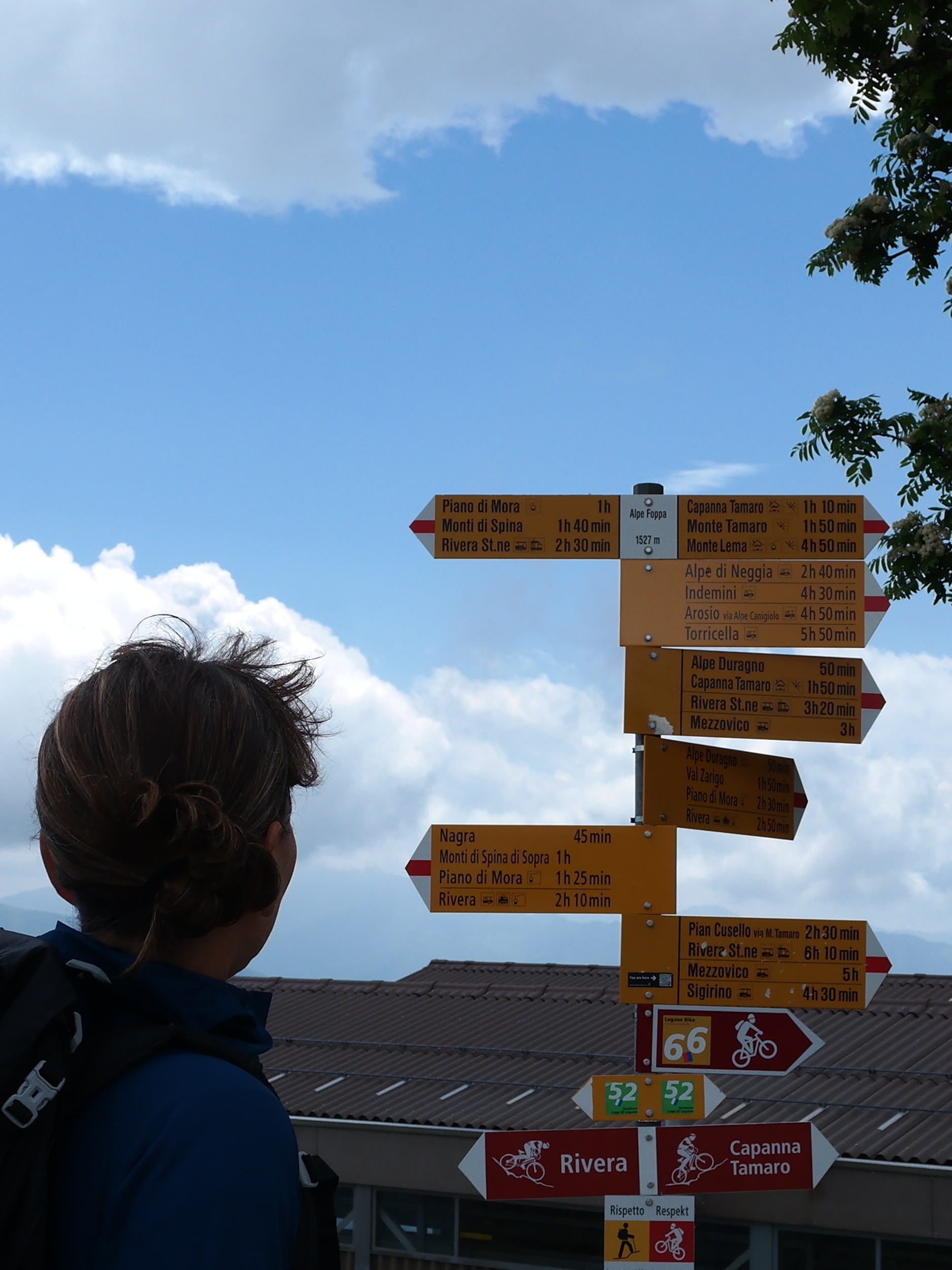 When we get to the summit of Monte Tamaro (1962m), there are about half a dozen or so people on the summit. We contemplate brewing a cup of coffee, then decide that it’s too windy and crowded. When we check the ‘wegweisers’ (signs) we suddenly realise that we don’t have a lot of time to play with. The last cable car from Monte Lema leaves at 17.15. It’s 13.20, and we still have three-and-a-half hour to go.