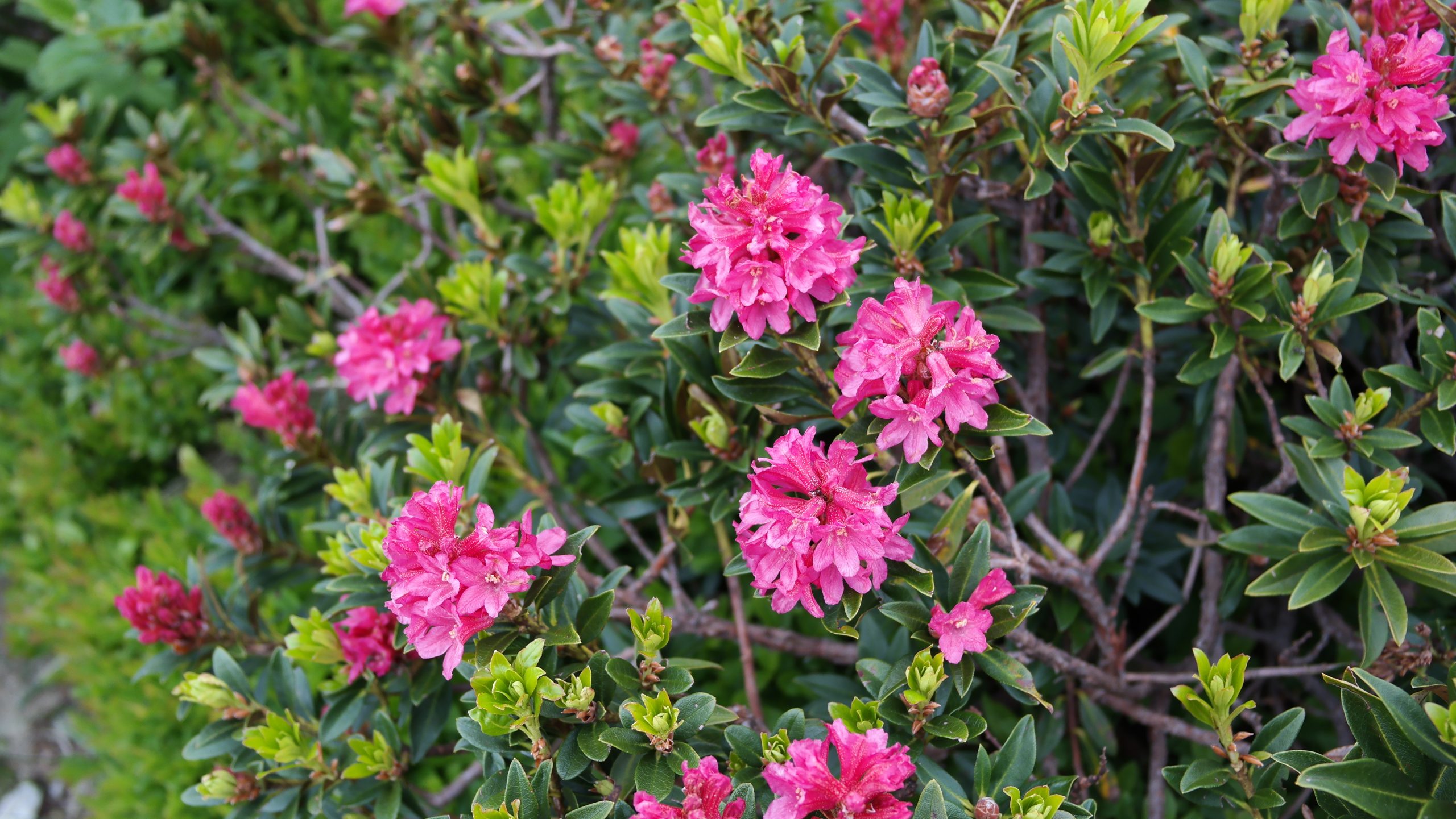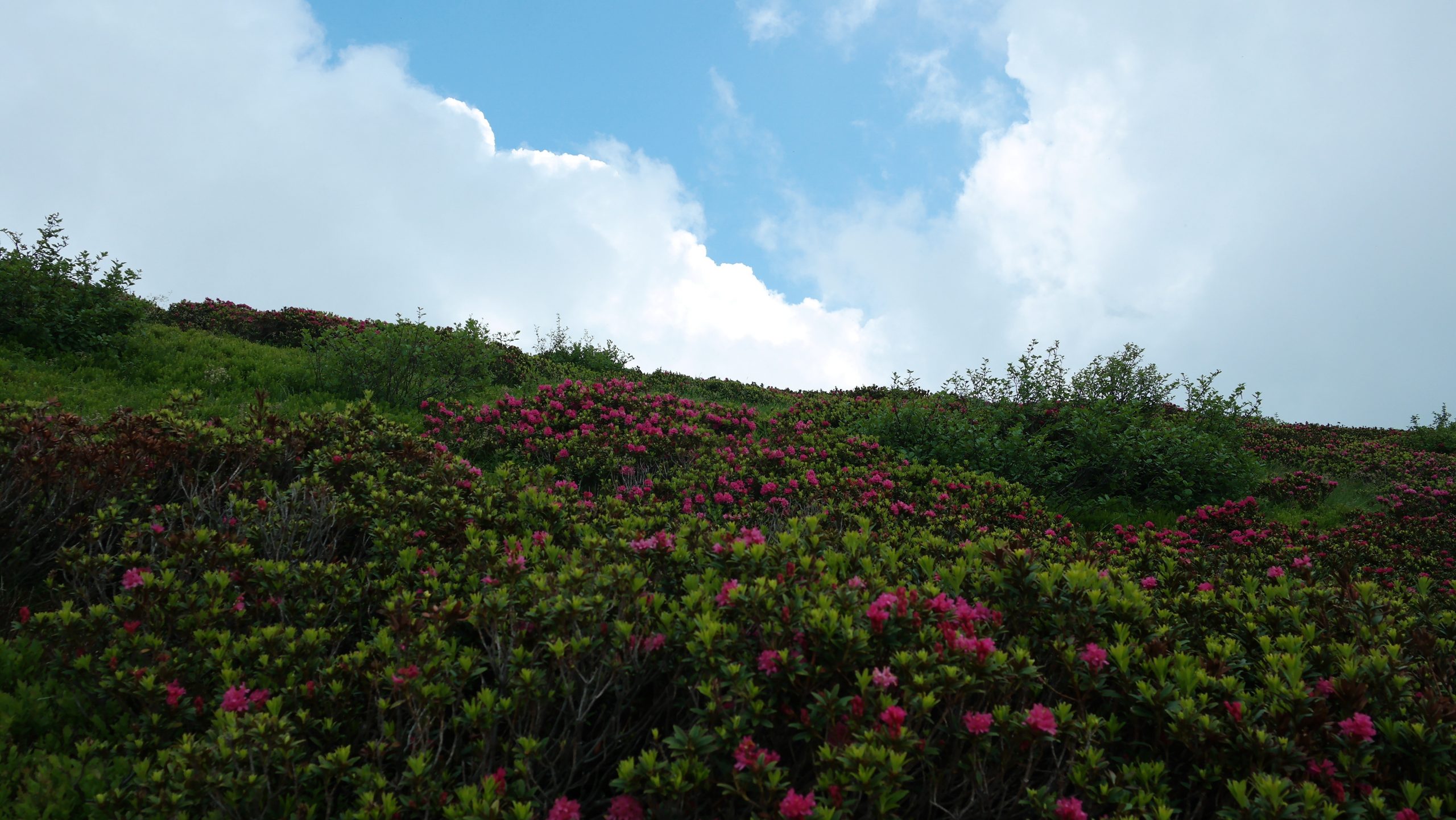 We walk through an area where almost every inch is covered in ‘alpenrosen’ (Rhododendron ferrugineum) and Elderflower trees. The combination of pink ground cover interspersed with the white flowered trees makes for an unforgettable sight. In the valleys below we see hamlets surrounded by forest. Every once in a while the sun peeps through the clouds and lights up the red tile covered roofs of the houses below.