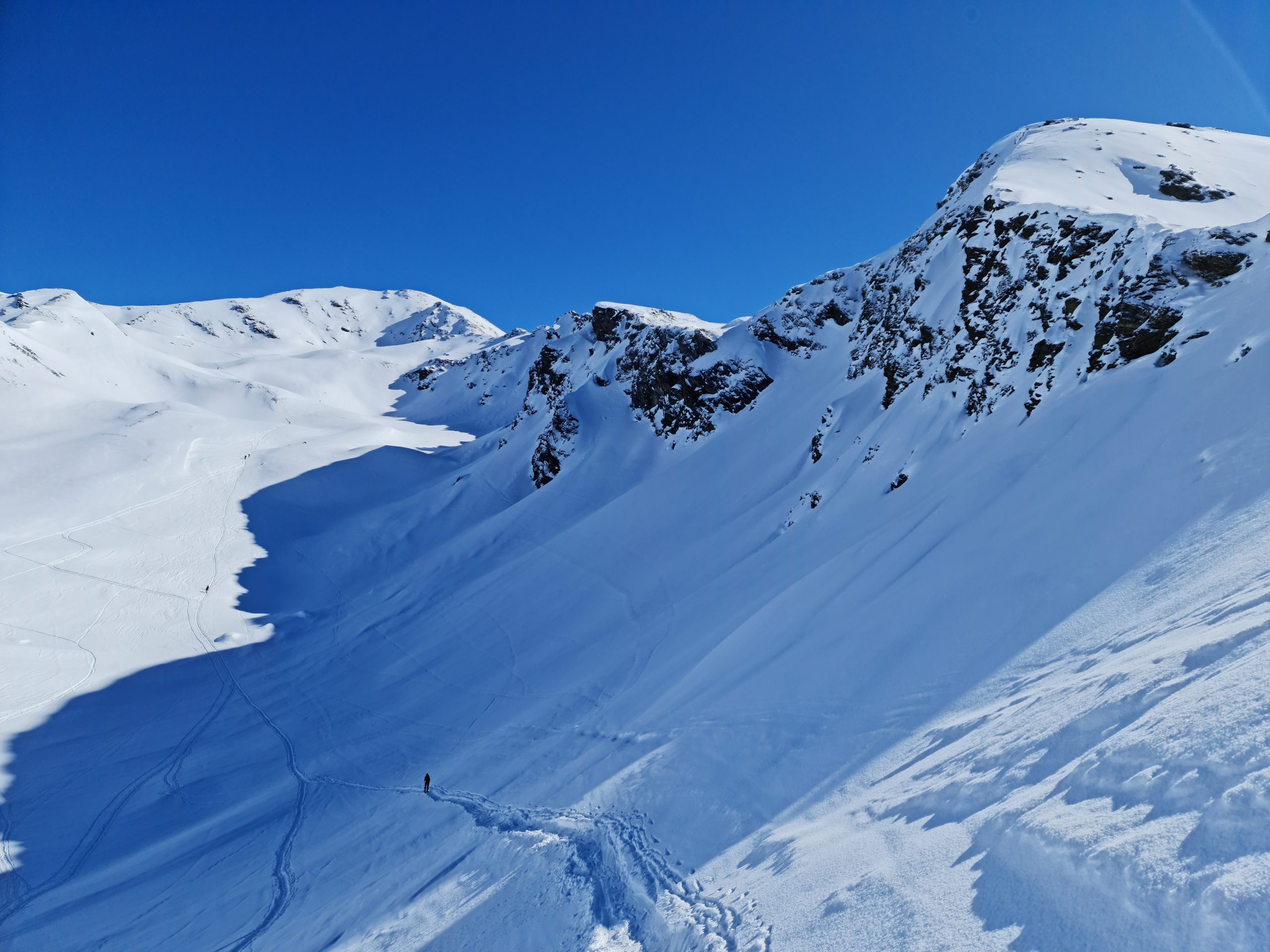 Just short of 3000m, Pischahorn looks like a pile of rock-rubble in summer. The last few hundred meters covered on scree. In winter, under snow, it’s a different story. Like last Saturday morning when we went back for our second attempt. Wedding-cake white. Covered in icing sugar from top to bottom. Only a few ski and snowshoe marks disturbing the almost pristine snow-covering.