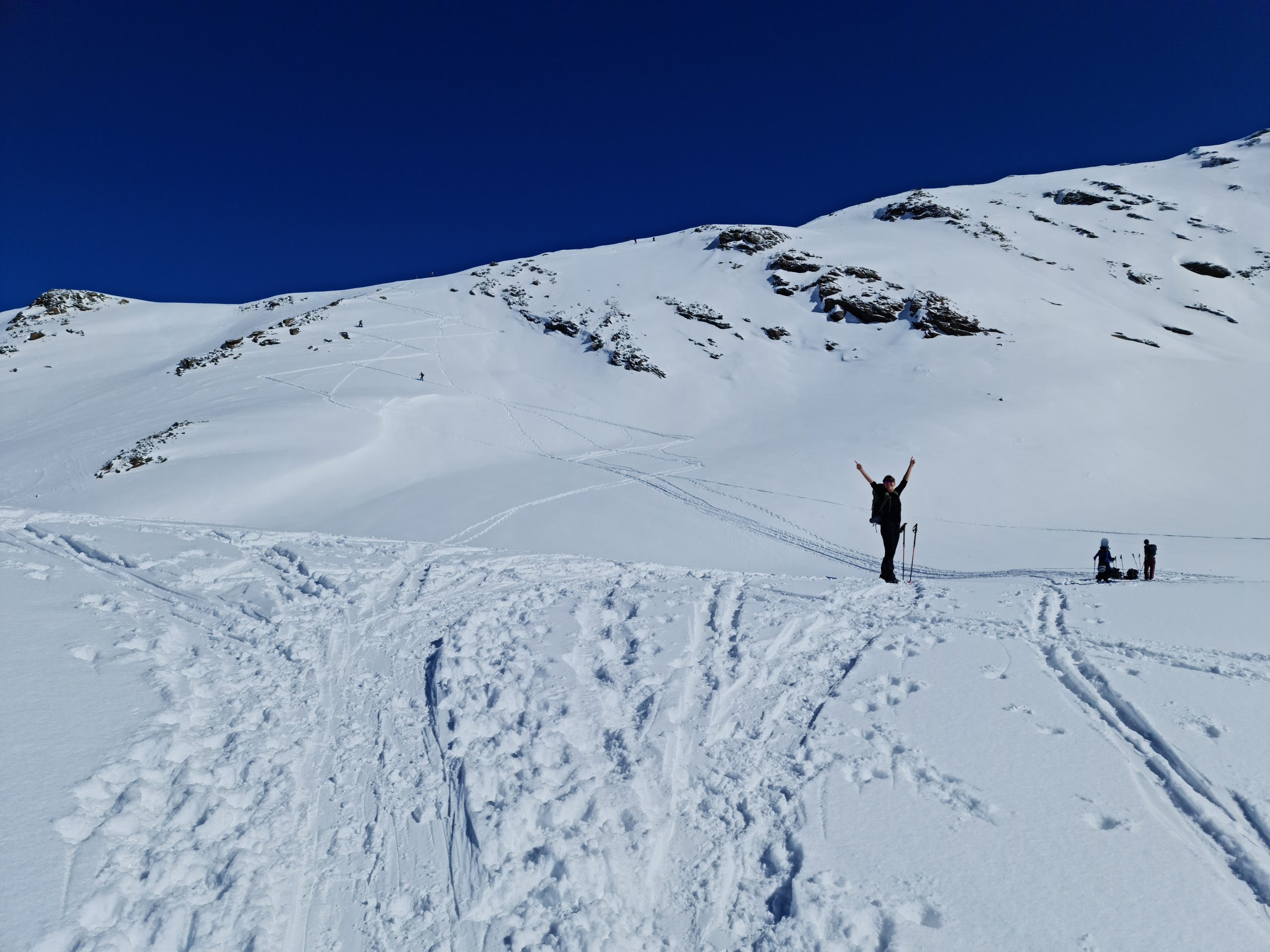 Needless to say we skipped signing the summit register. Took a quick selfie to prove we had been on the summit of Pischahorn, and then made our way back down. Out of the wind. We stopped about a 100m below the summit, and made ourselves a sandwich with avocado filling and cheese on the side. It’s too cold this time of the year to get the stove going properly, so we drank tea from our flasks. (Increased altitude and severe cold are not friends of the gas stove – Boyle’s law, observed in a real-world situation…)
