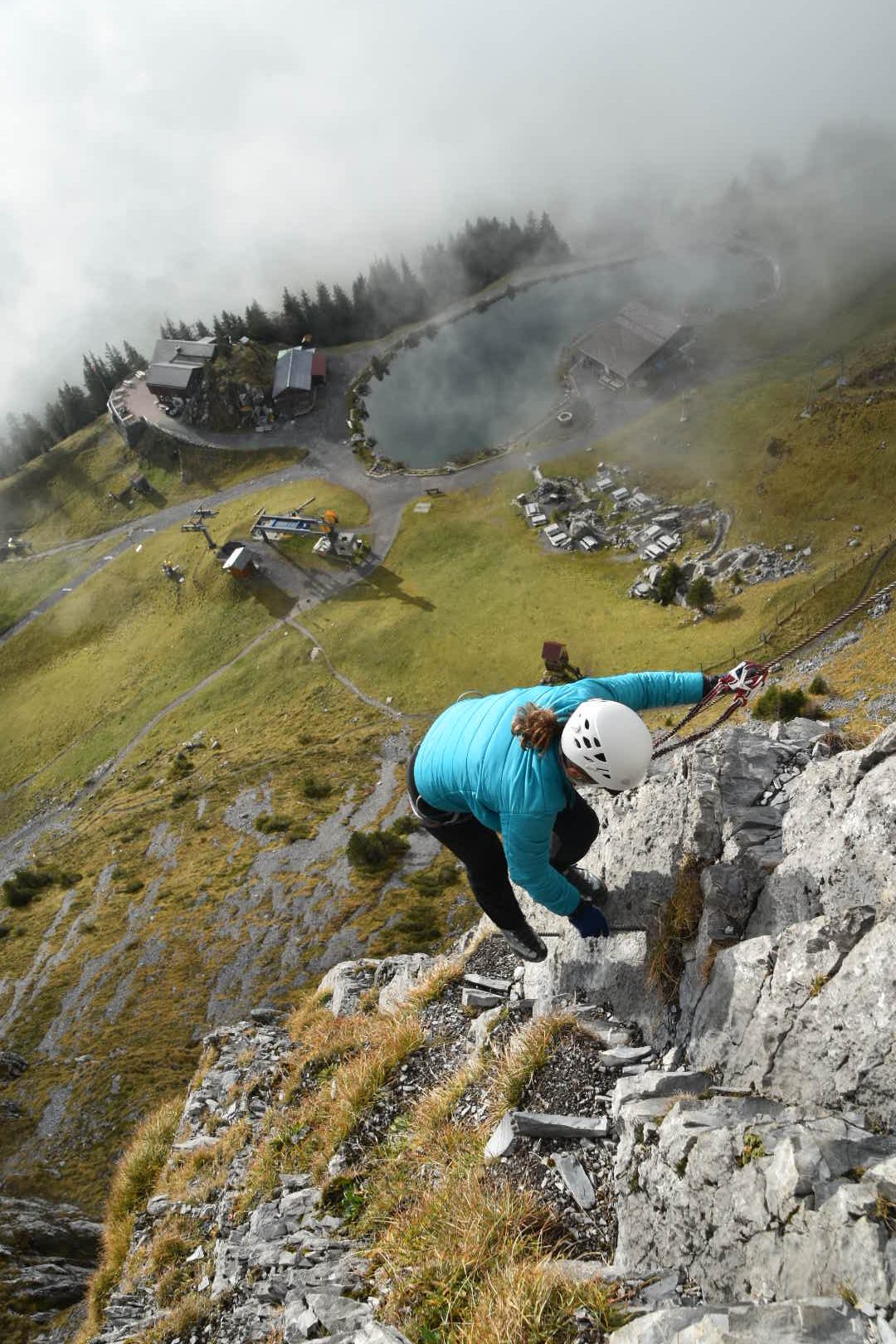 It’s Saturday afternoon. The mist is swirling around us. Clearing occasionally to provide a tantalizing glimpse of Rigidalstock above. We’re here to climb Rigidalstock’s two superb via ferratas: Rigidalstockwand (K4) and Rigidalstockgrat (K3). We hope that the weather lady was right and tomorrow is going to be a brilliant day.