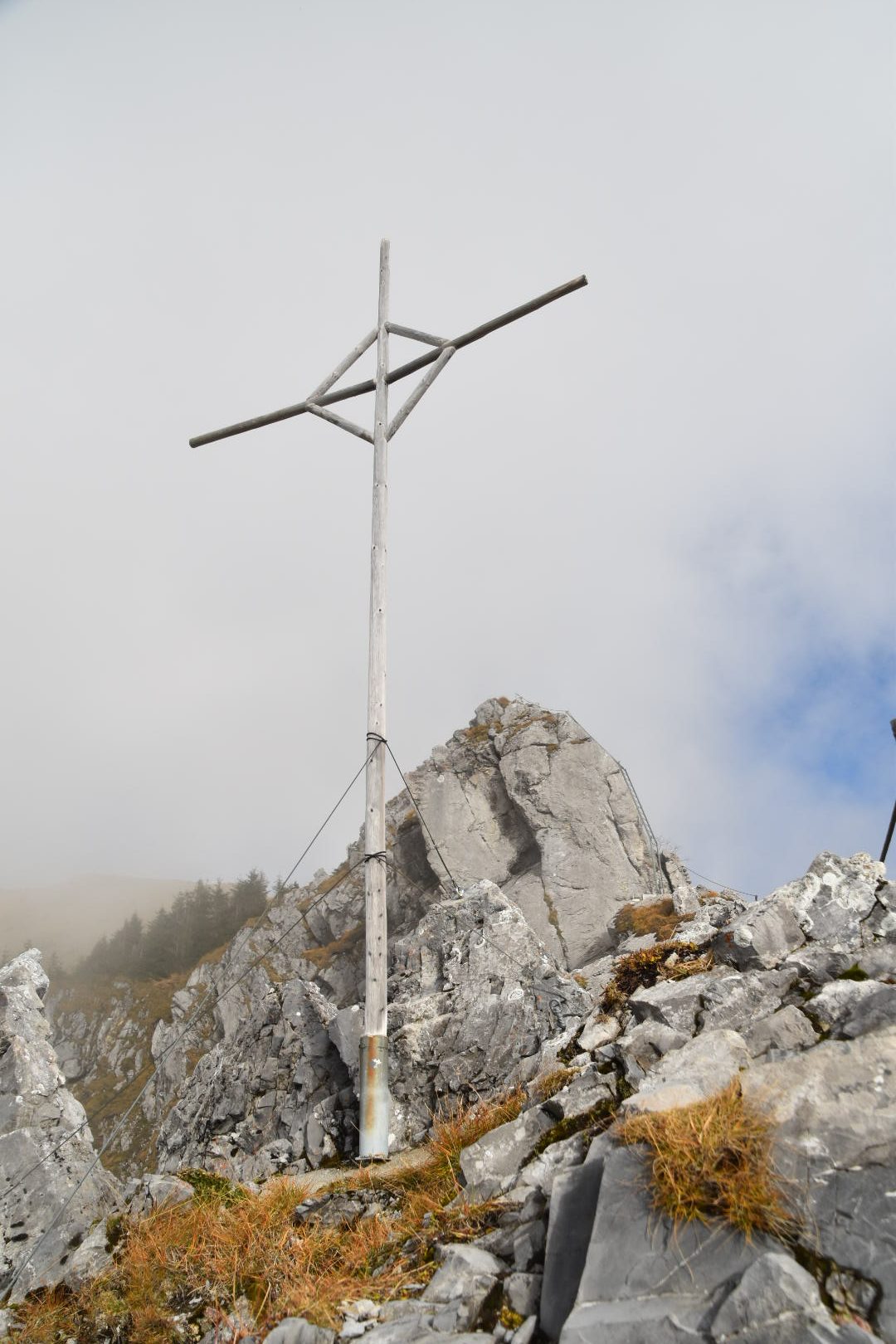 On one of the steep sections we encounter a party of about 5 people. We can stand safely on a shelf and let them through. Another party who hadn’t yet started this steep section wait for us to clear the final part of this section. They had wanted to do the ‘Wand‘ route, but had found the ‘Closed’ sign and the cable dismantled, and so decided to do the ‘Grat‘ route up and down. We meet a few more parties who are on their way up. They’re disappointed that they weren’t able to get a last via ferrata in before the cables are dismantled. We understand their disappointment. We also understand that the team dismantling had to do it today, as the weather forecast for the next week is dismal, and removing the cables would not have been possible later in the week.