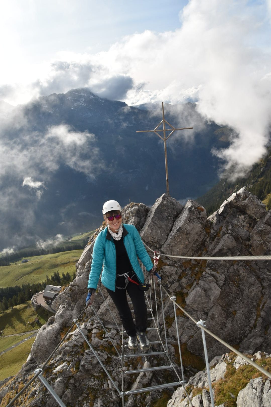To keep ourselves busy for the afternoon, we decide to amuse ourselves on the short but testing Zittergrat via ferrata on the Brunnistöckli. Barbara somewhat reluctantly at first; not having done a via ferrata for a few weeks. And progressing straight to a K4 had her worried. But not for long. Described as “Schwieriger Klettersteig über Engelberg” (Engelberg’s difficult via ferrata), it is definitely not for the inexperienced. Why the name has ‘grat’ (ridge) in it, I still don’t know. The Zitter part I do understand! I reckon more than one climber will experience a few ‘Zitter-ing’ (quivering) legs on this steep little ferrata. We’re on our own. Contrast to the last time we were here and the easier via ferrata looked like it had a row of climbing ants on it…