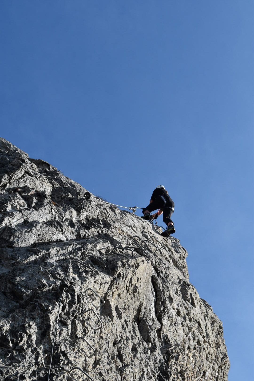 The first part is steep and vertical, followed by a superb traverse under a roof. Then it eases off a little, and a bit further on to an easy section where you can catch your breath. But not for long before you have to tackle the next two hard and vertical sections. It eases slightly on the next three sections. The last of the three with an airy step over a huge gap. One further steep and hard section follows and then you’re on the final bit to the summit cross of Brunnistöckli.
