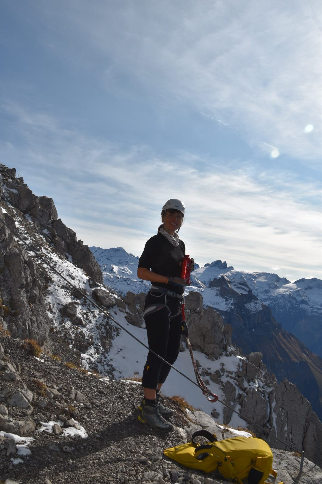 As we make our way up towards the ridge that connects with the Rigidalstock, we can see them not too far behind us. We find our way across a snow-covered area onto the first part of the ferrata. Behind us the two are putting up ‘Closed’ signs and starting to dismantle the cables. As we progress upwards, we can see them working behind us. Barbara and I are the last two people doing this ferrata this year!