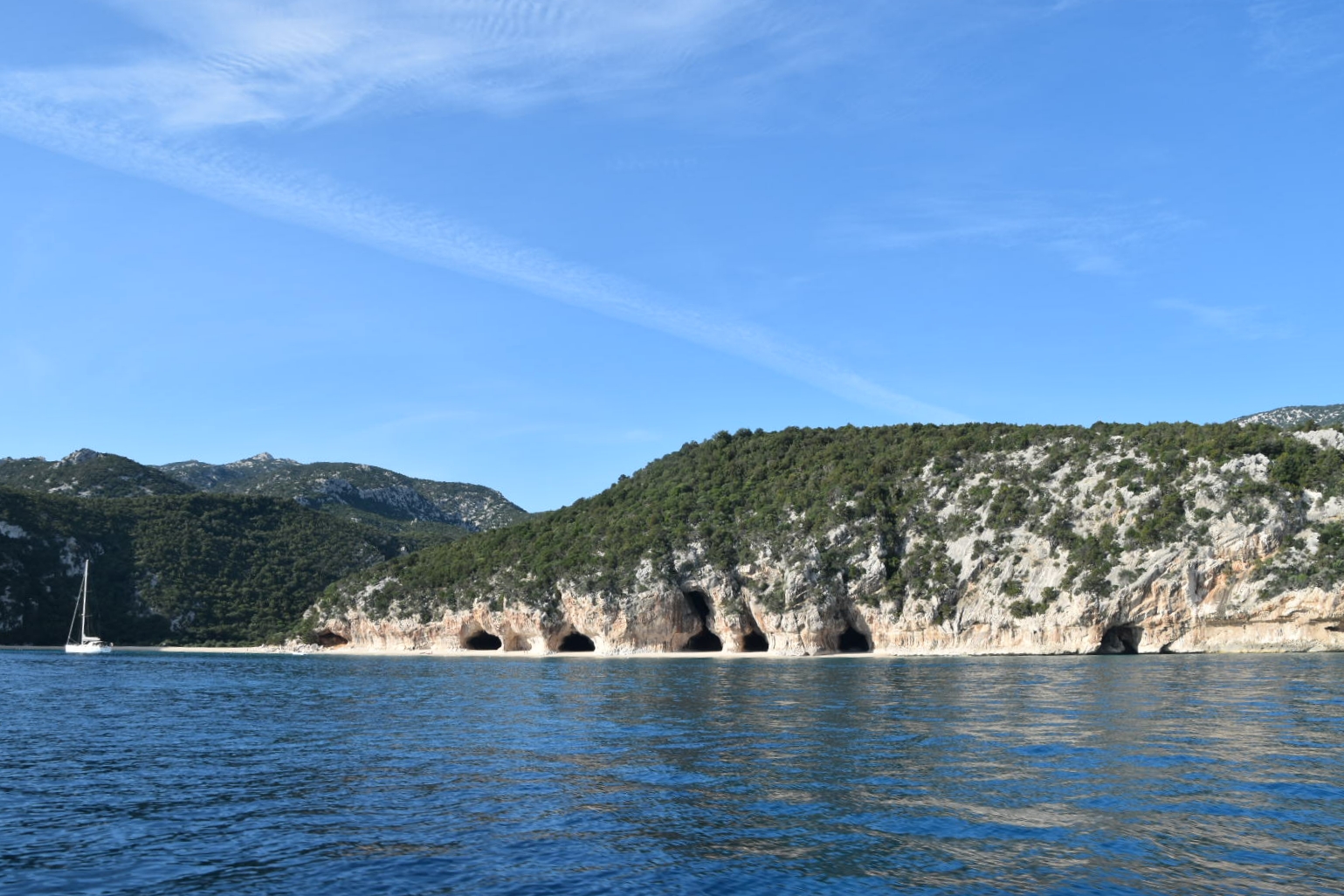 Our first stop is the sublime Cala Goloritzè. Exploring the archway. Admiring the Aguglia from different angles. Then we set off towards Cala Mariolu. It’s nearly deserted. We decide not to land. Many beaches, coves, caves, and rock arches to explore. But before we move on, we’re going to have a swim. We drop anchor. My clothes are off first and I drop overboard into the clear blue water. Fresh. Barbara follows. Boats pass by and wave. Then we clamber back on board, get some clothes on, and set off for the next bay. At the tiny Cala Mudaloru we sail close to the bay, but because of its narrow approach and worried that the boat may drift into the rocks, we decide to anchor further out. Clothes off we swim to the shore. The dinghy suddenly looking very small and very far away. After a while we swim back. A few boats coming to take a closer look at this tiny but perfect little cove pass by. One nearly hitting our boat, resulting in a lot of shouting on the boat and an older person taking control and speeding off. When we’re back on board, we pull up anchor and move on. More places to explore. Past Grotto del Fico – another cave with walkways that can be visited by tourists. Then a few smaller calas before we reach Cala Sisine, where we started our walk yesterday. Sardinia’s Eastern coastline revealing hidden gems as we make our way.