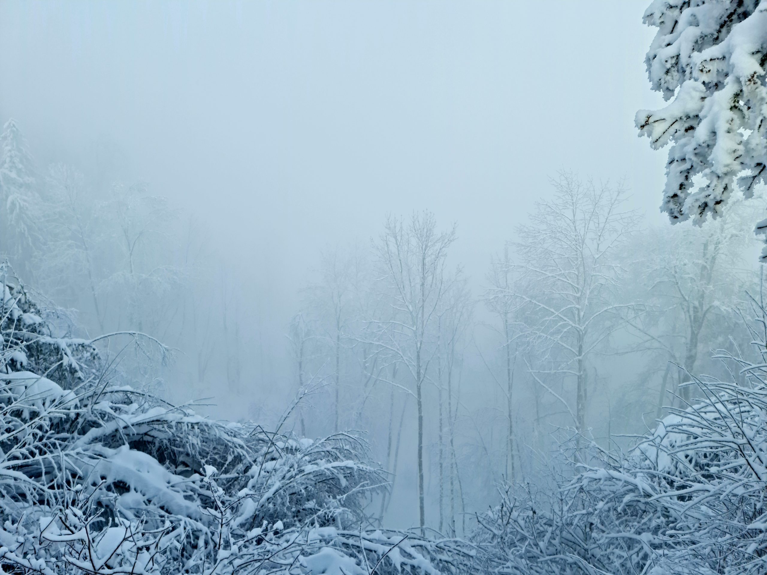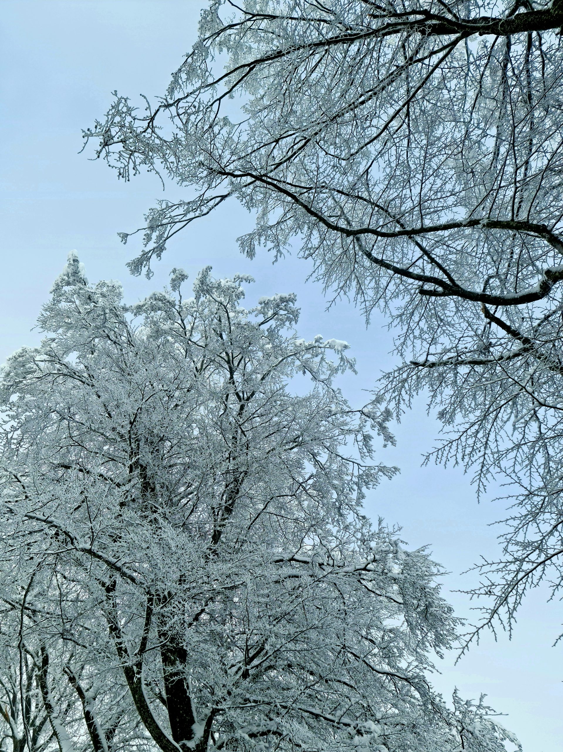 The winter wonderland starts as we cross the common. Everywhere around us, trees are draped in thick coatings of snow creating sculpt-like structures. Others look like they’ve been covered in a thin layer of ice. Here and there we have to climb over or under trees, brought down by the weight of the snow, that have fallen across the path. In some places the path is completely obscured by the fallen branches and debris covering it, and we have to guess which way to go. But, overall, it’s not too difficult to find our way. Round every bend there’s a fascinating new view of trees and plants covered in snow.