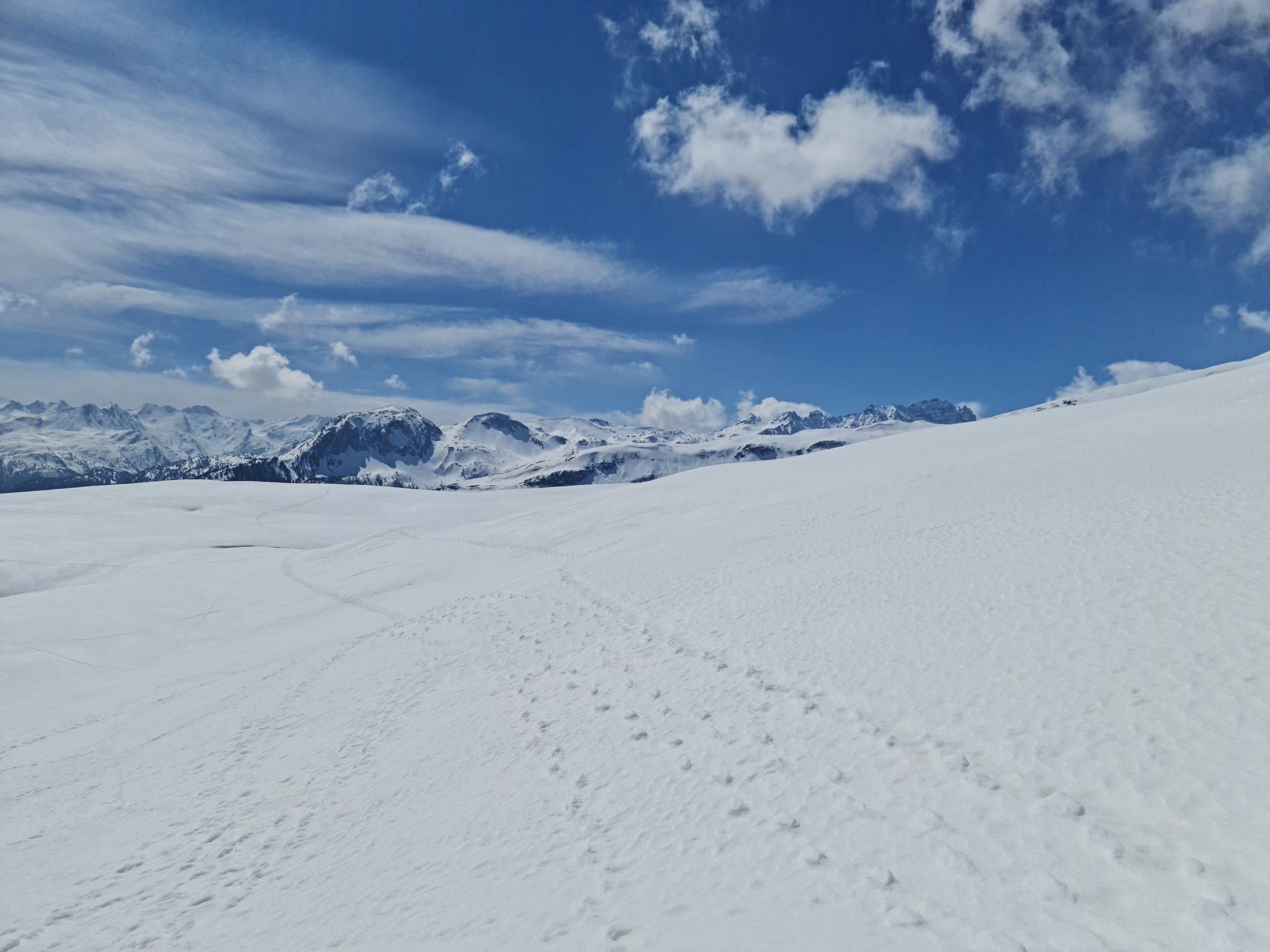 After a few kilometres we saw a tiny mountain hut, decided to shelter in its lee and have some coffee and make sandwiches. Turned out to be a perfect little oasis in the middle of the snow-covered desert-like terrain. Then we continued, making our way through snow that wanted to swallow us in places. The views across the Grisons and Piz Beverin above us remained spell-binding. Libisee was covered under snow. We could distinguish the outflow, by comparing the terrain with the map, but other than that, we had no idea if were walking on the edge or in the middle of this little lake.