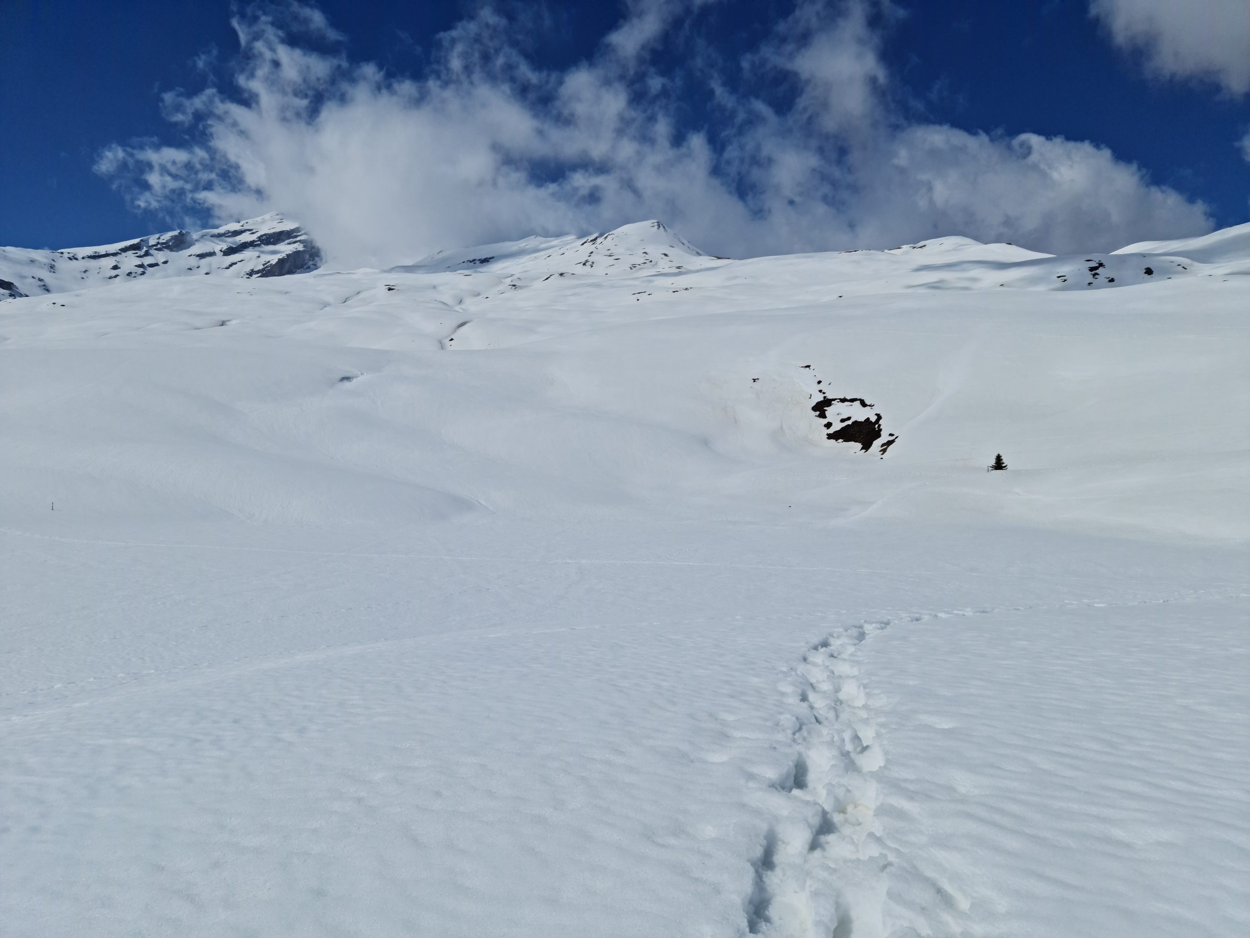 We left a small bag with toiletry kit and some spare bits of clothing in the boot room, and then set off for Zwölfihorn, nearly 800 vertical metres higher. We started off on the same path as we followed yesterday. After about two or so kilometres we diverted onto an unmarked trail. We donned snowshoes as soon as we got to the snow-ice path of yesterday. Expecting it to be even more frozen and slippery than yesterday. Especially after a night where temperatures dipped well below zero.
