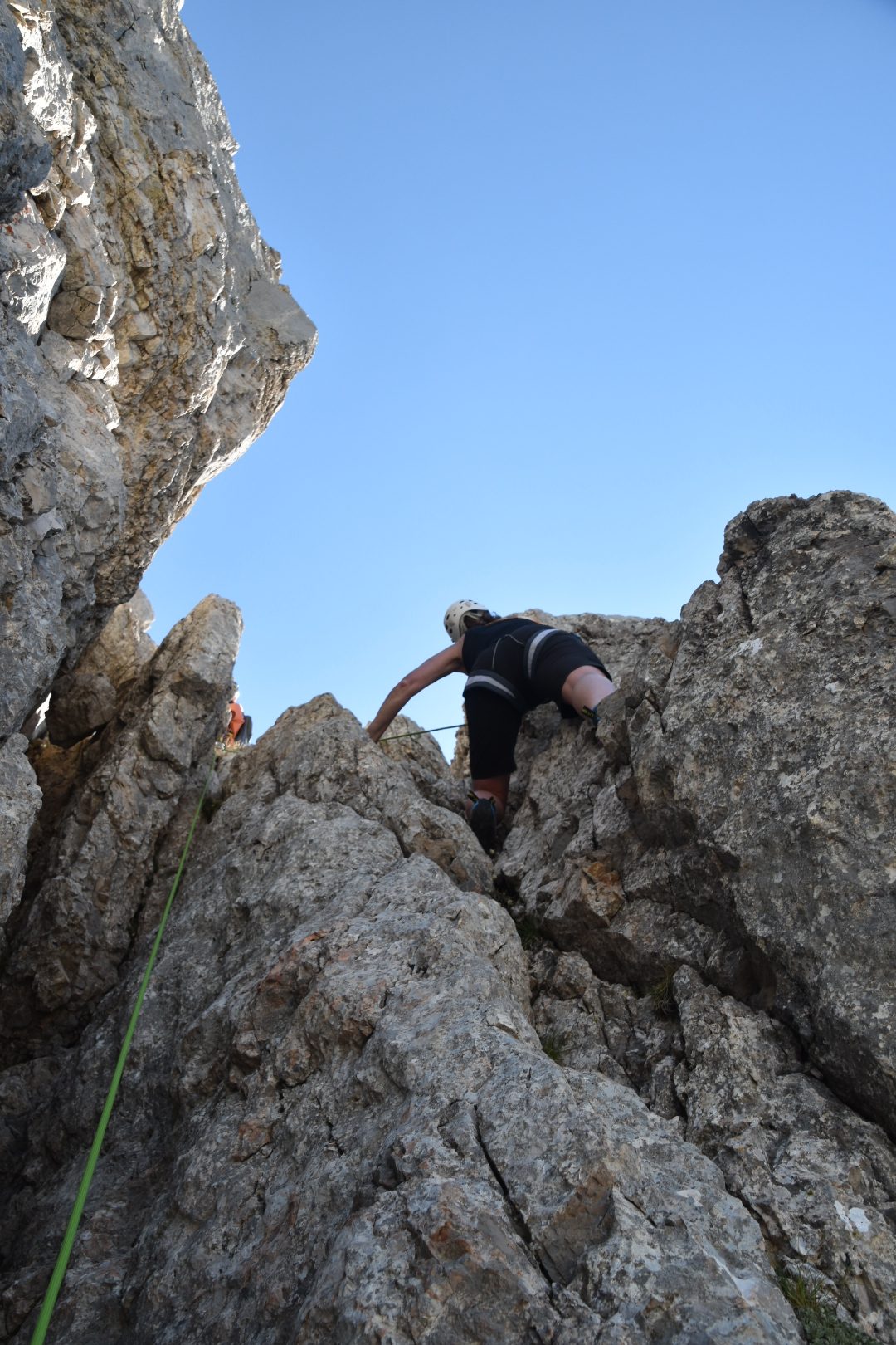 Then we rope up. We’ll use a short-rope technique on the easier pitches – the grade 3s – in order to save time, and pitch the grade 4+ crux pitch, the long traverse and the final vertical wall. The 4+ crux pitch is an approximately 1 meter wide vertical crack about 4 to 5 metres high with a huge boulder jammed in at the top of it, making for a super hard and awkward exit… despite Alessandro making it look dead easy…