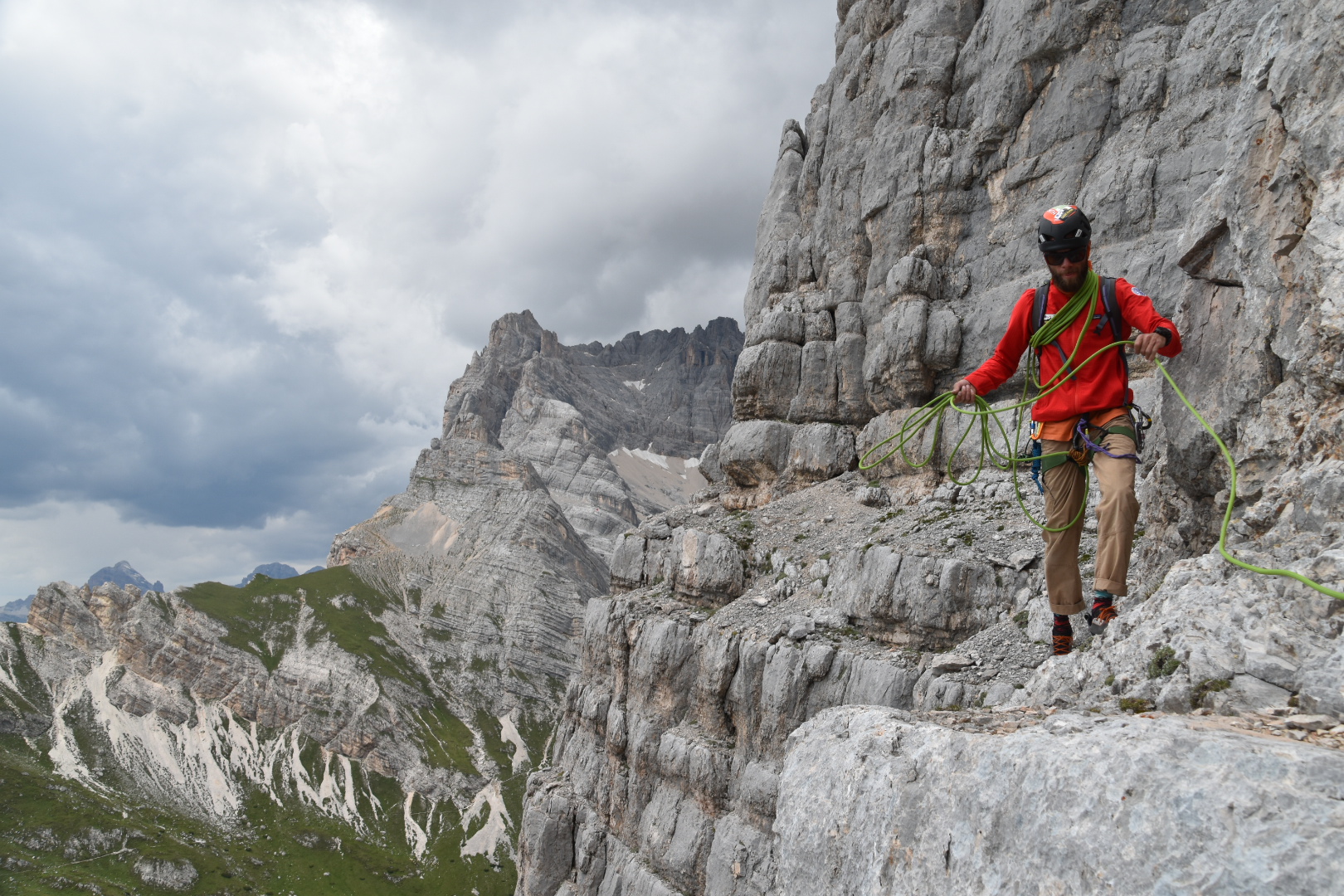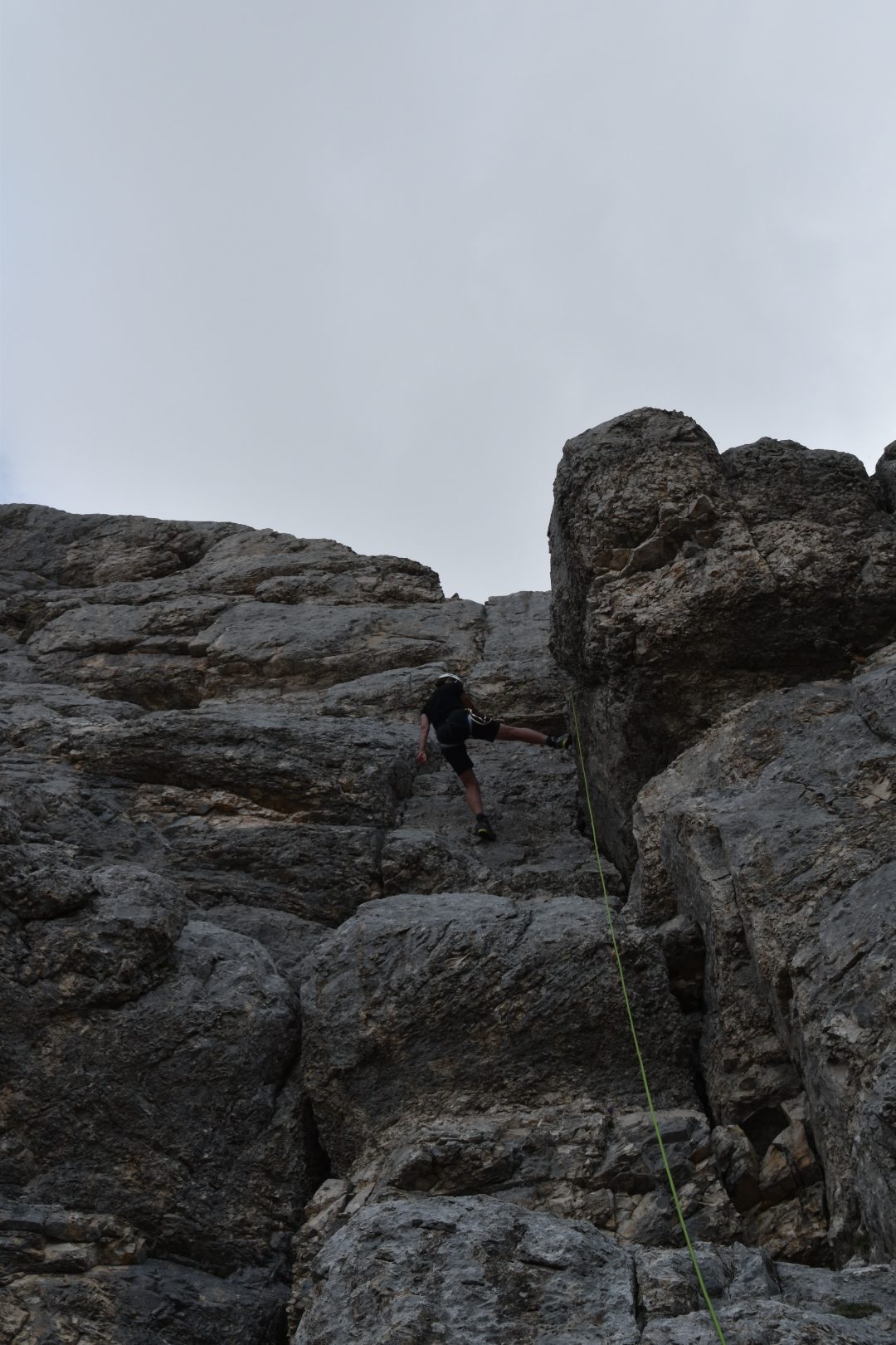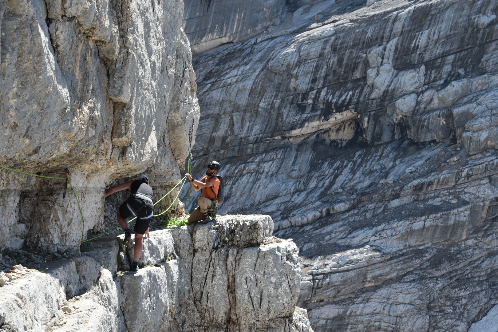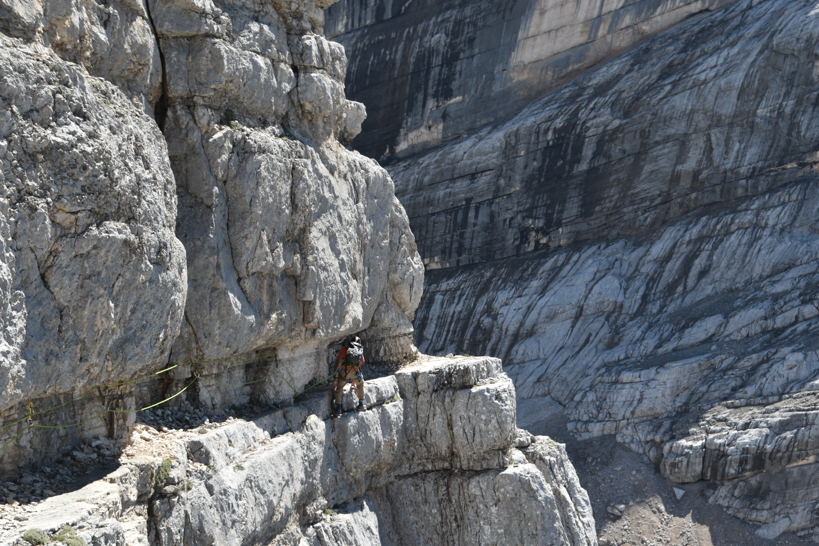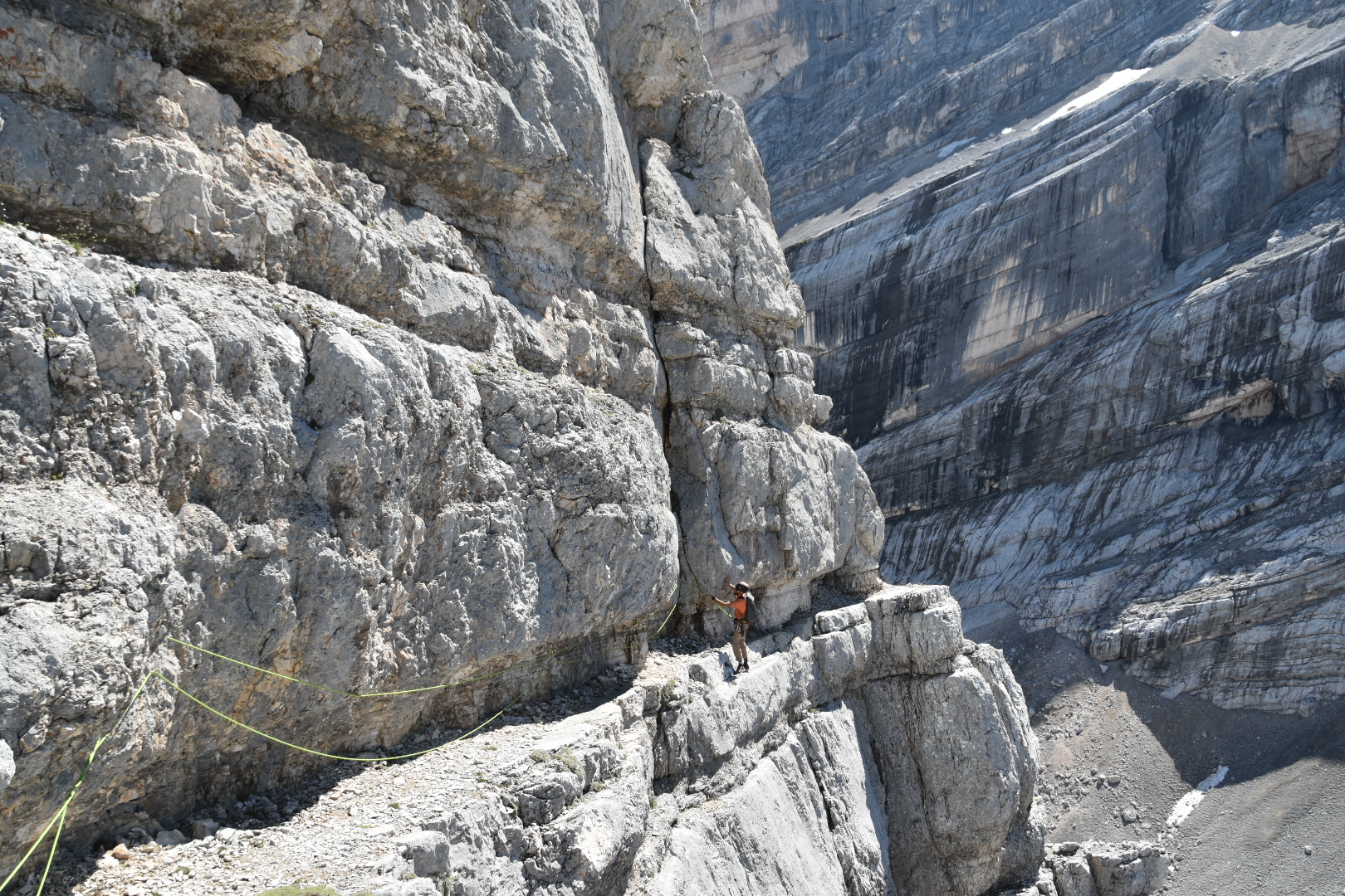 The crux pitch is followed by another short-roped section which brings us to the start of the 30 odd metres of horizontal traverse – the finest in the Dolomites according to Alessandro! Turns out to be every bit as good and exciting as the best on Table Mountain (Cape Town) with its multitude of horizontal rails.