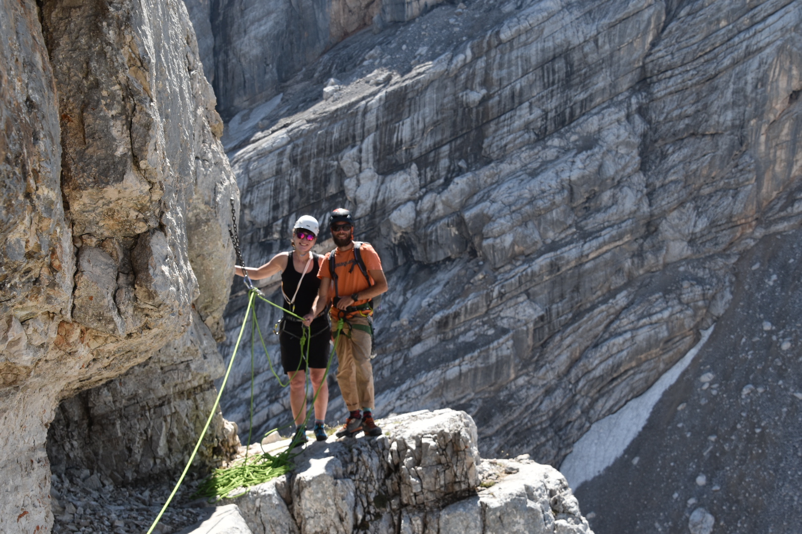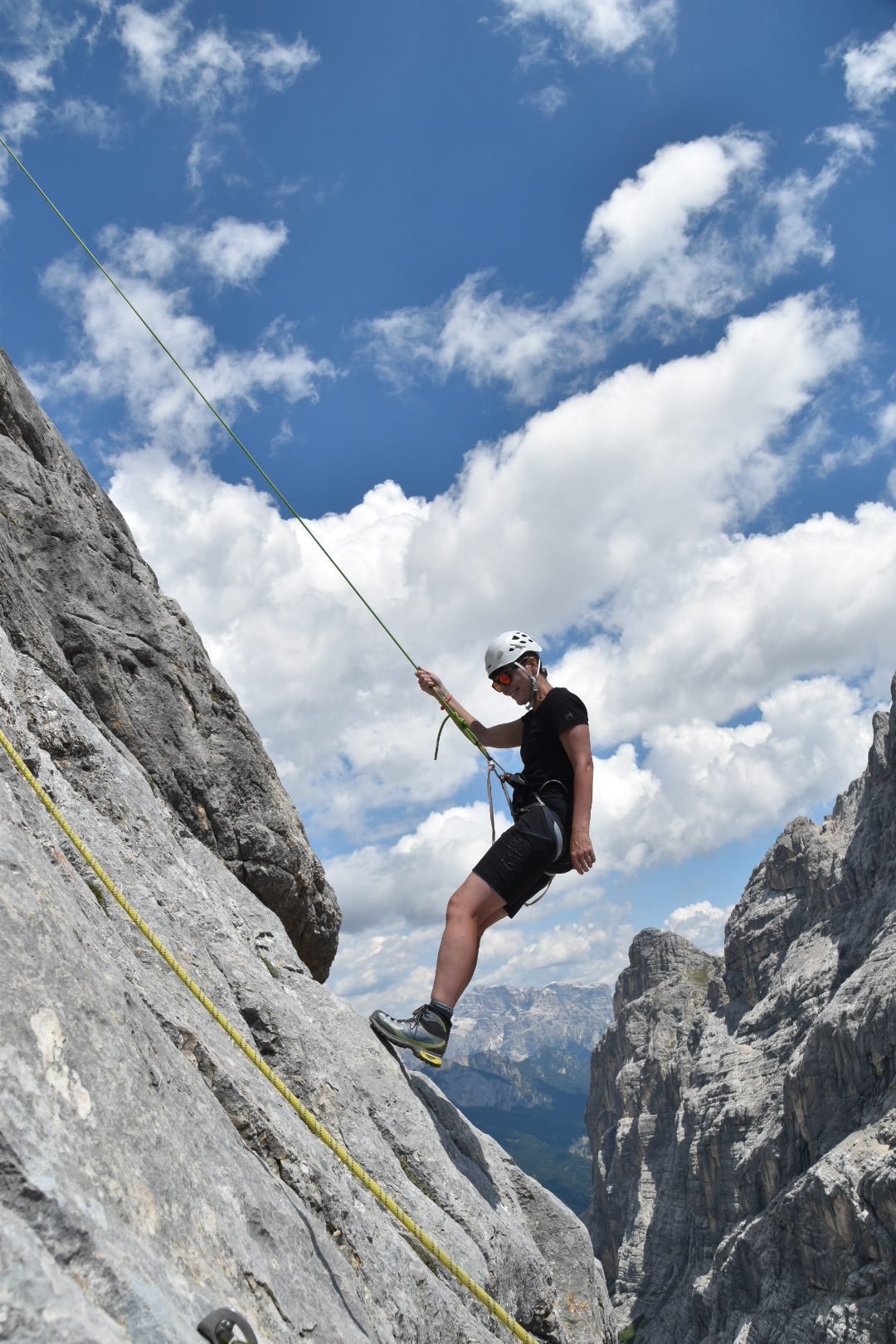 As we are about to start our descent, the other two (Paulo and Francesco) are making their way up the final vertical pitch. As soon as they’ve cleared my descent path I start rappelling down. I tie into the belay station and shout up that I’m safe; Barbara follows and we tie her in and shout safe and then Alessandro rappels down last. We pull the ropes through and then the process is repeated until we land on the wide ledge just above where we started. We down climb the final few metres and then celebrate again with another round of handshakes and hugs!!