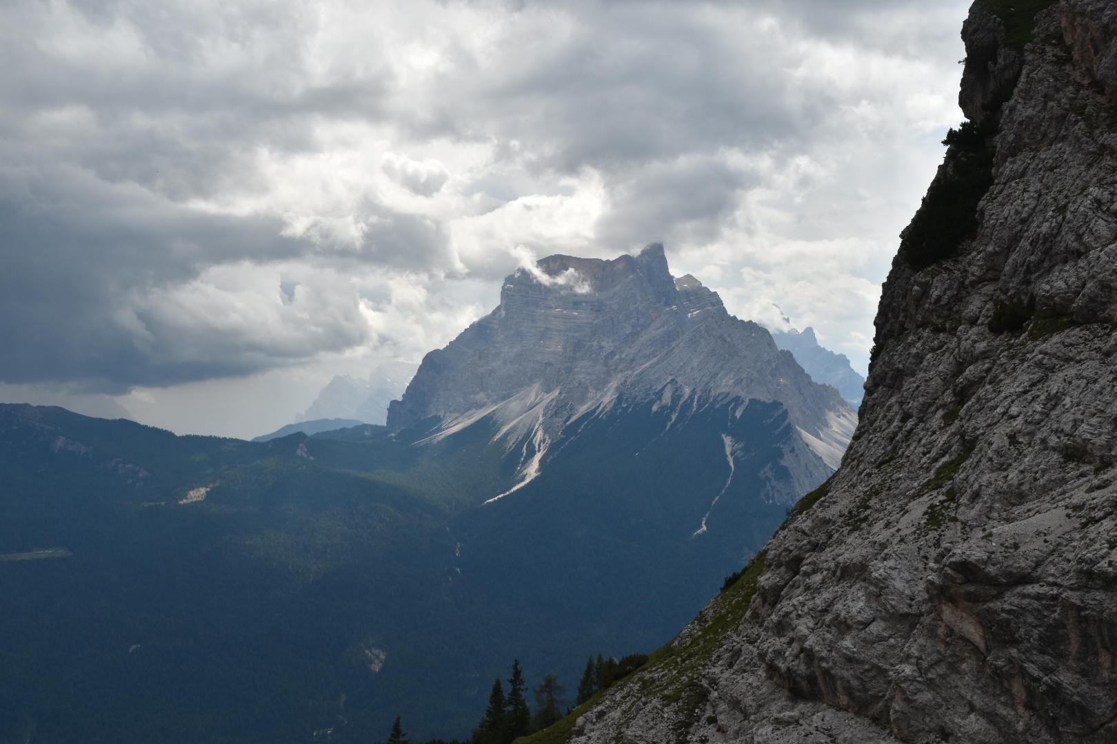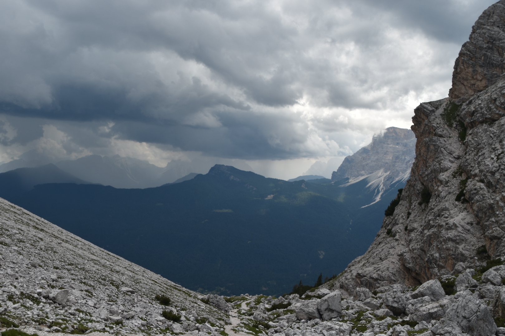As we walk back to rifugio San Marco we get peppered with a few random rain drops. Enough for us to take the precaution of putting rain covers over our backpacks, but not enough to bother putting raincoats on ourselves. Across the valley though it looks a lot more dramatic with what looks like a torrential downpour creating a curtain of mist which obscures the distant mountains…