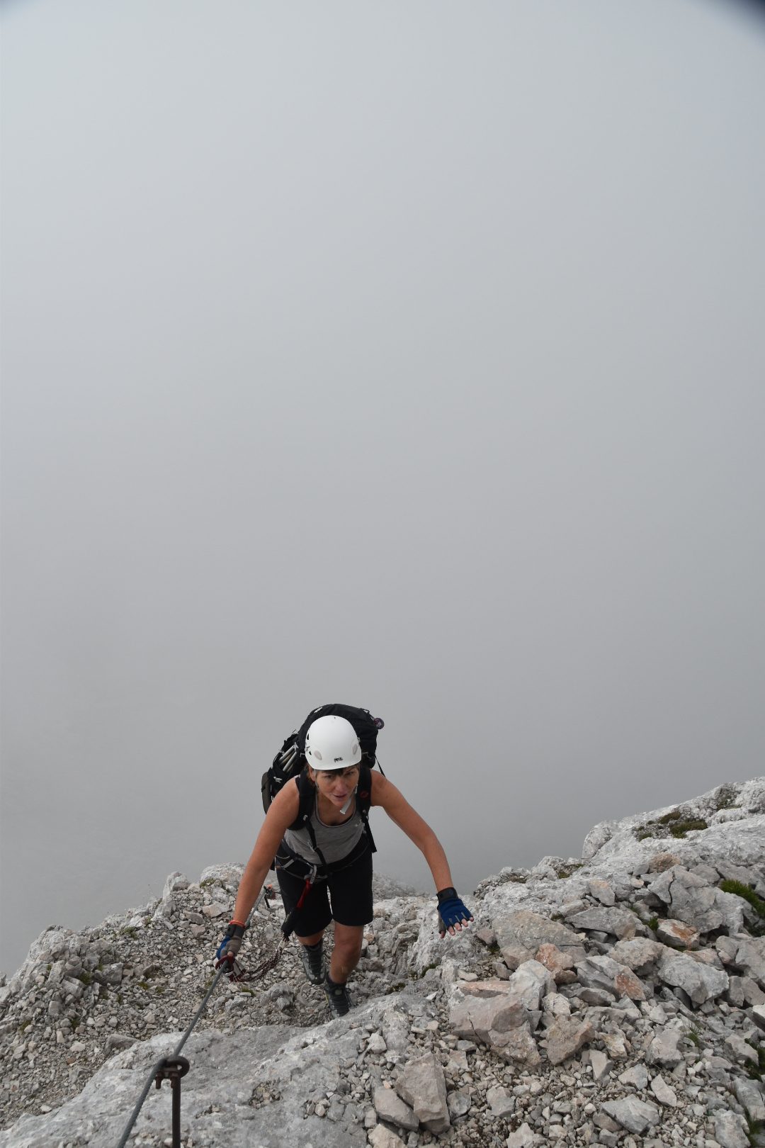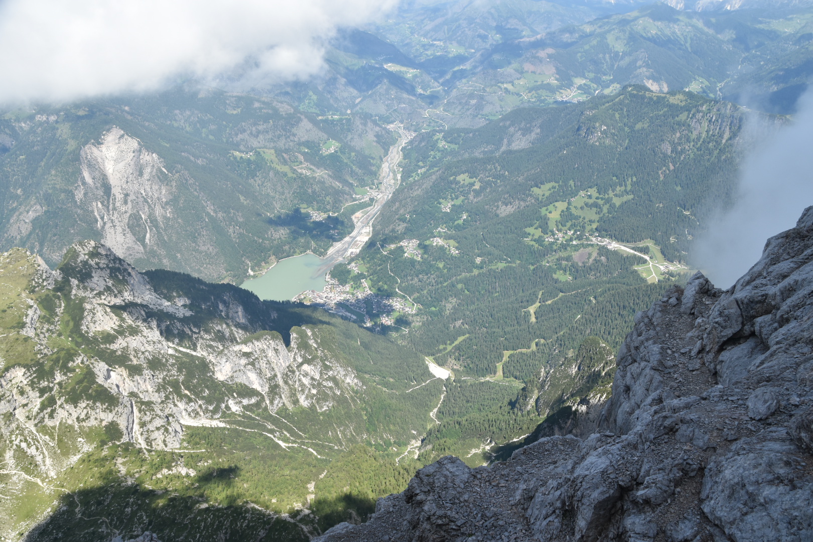 The needle showing up vaguely in the mist below on via ferrata Alleghesi
