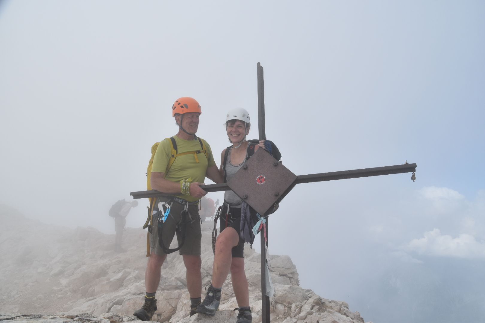 Gear up at the base of the ferrata and off we go. A little way up the sun ‘disappeared’ and the mist settled around us reducing visibility to what you can see around you. We only saw the sun again 800 vertical metres higher when we reached the summit. With the mountain acting like a divider, we had brilliant sunshine beaming down on us at the top and views that went on and on on the northern side of the mountain overlooking the Alleghe valley. On the southern side the cloud refused to budge – hiding the magnificent views across Pelmo, Antelao, Sorapiss, Tre Cime, etc., etc., and beyond to Grossglockner – the highest peak in Austria.