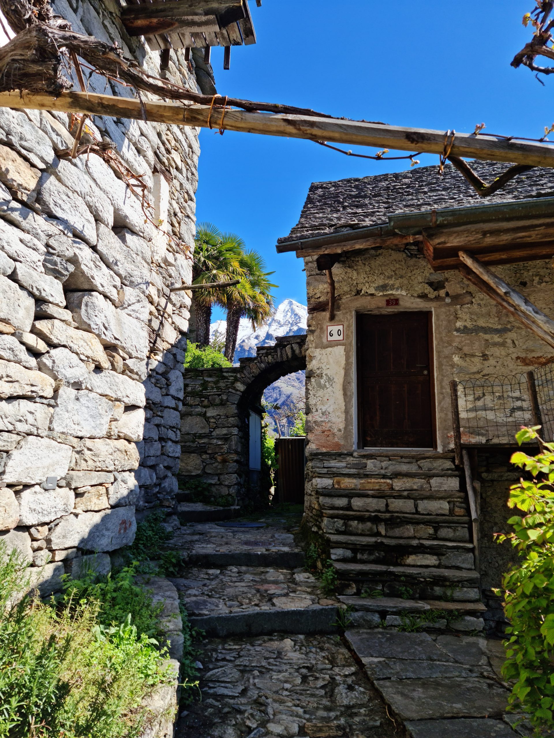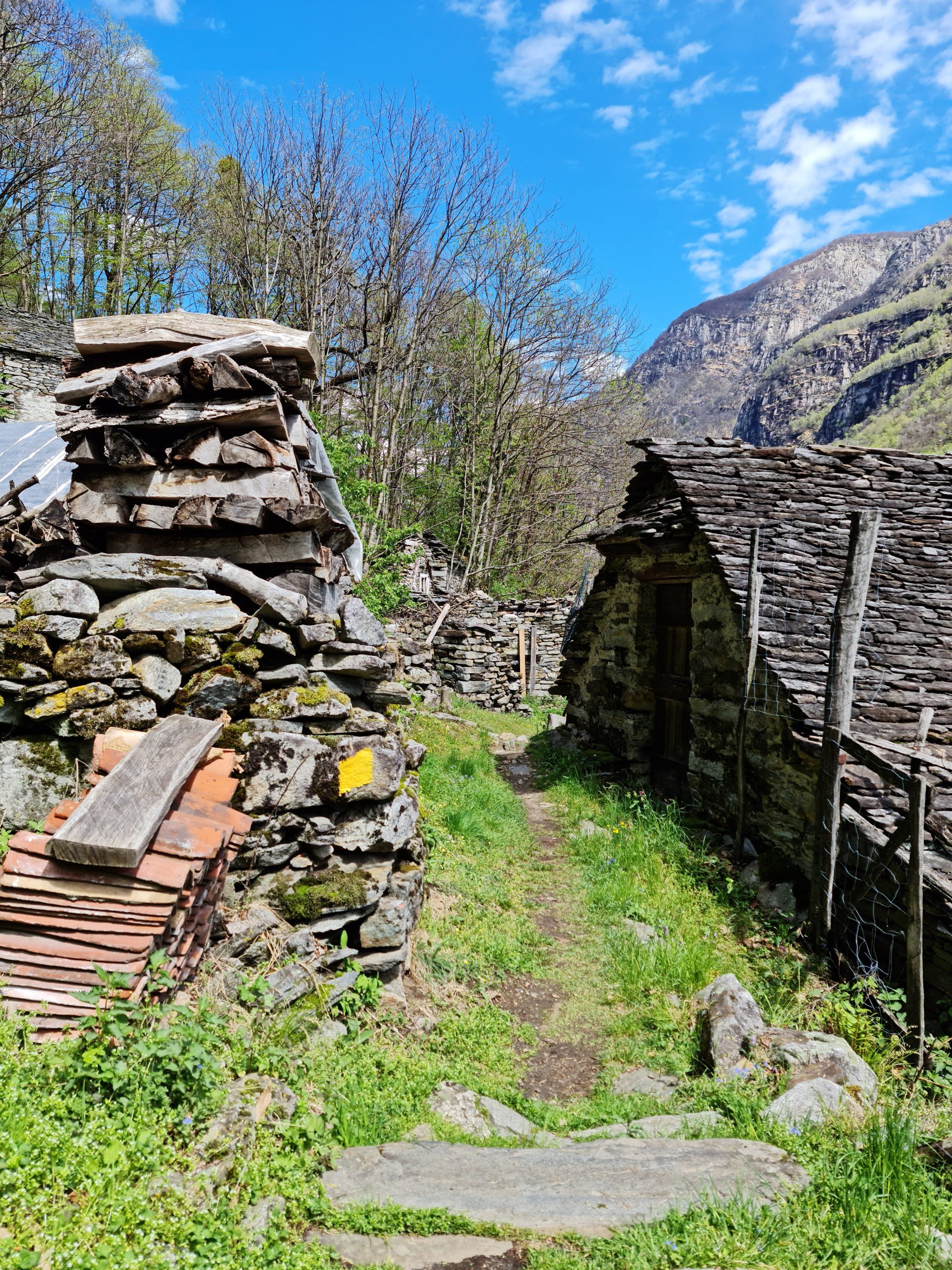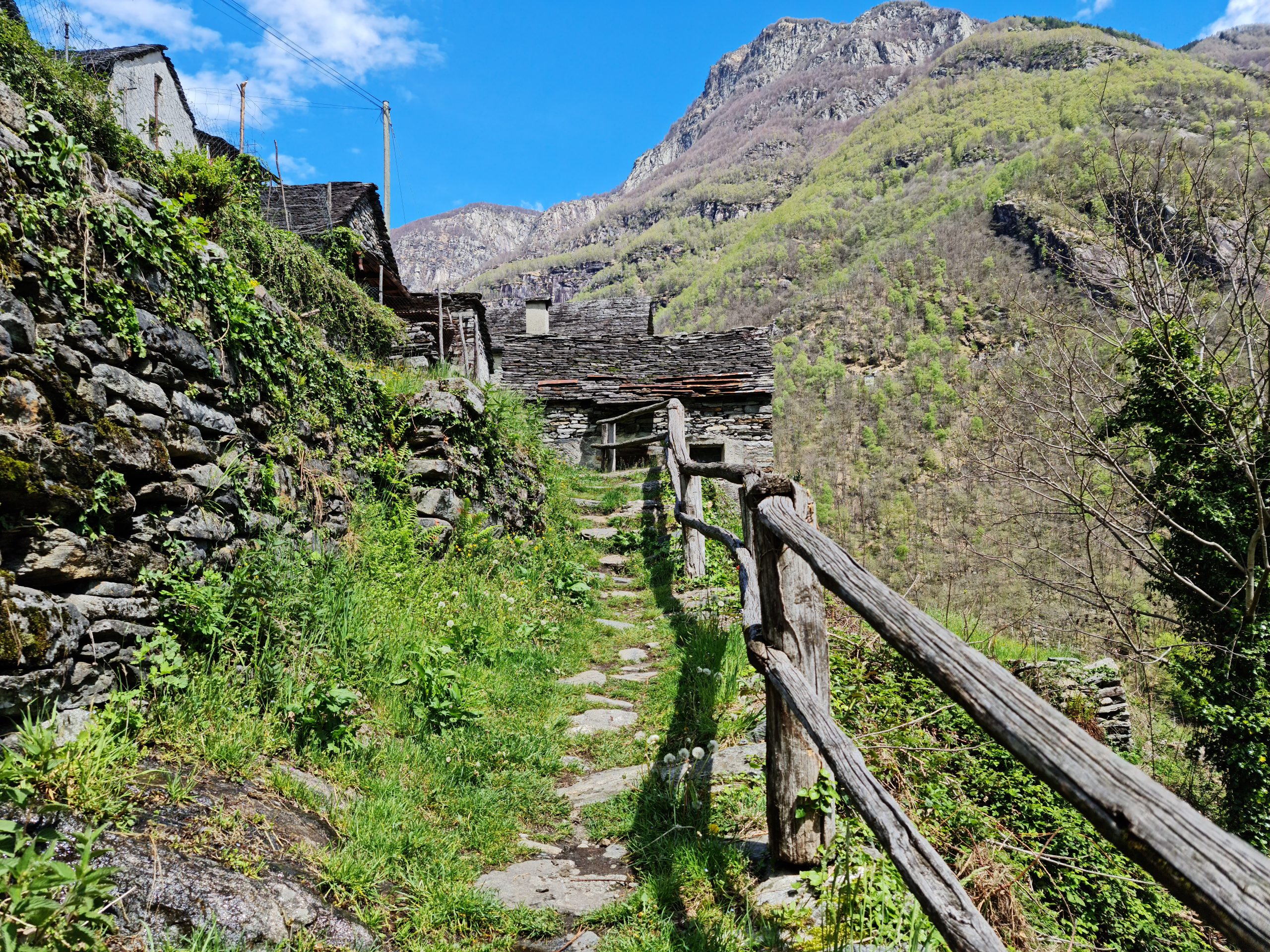 Sunday morning. We’re on the early train. On our way to Locarno in Ticino. Then onto a bus heading for Mergoscia, a tiny hamlet set on the hillside overlooking the valley. The starting point of our hike.