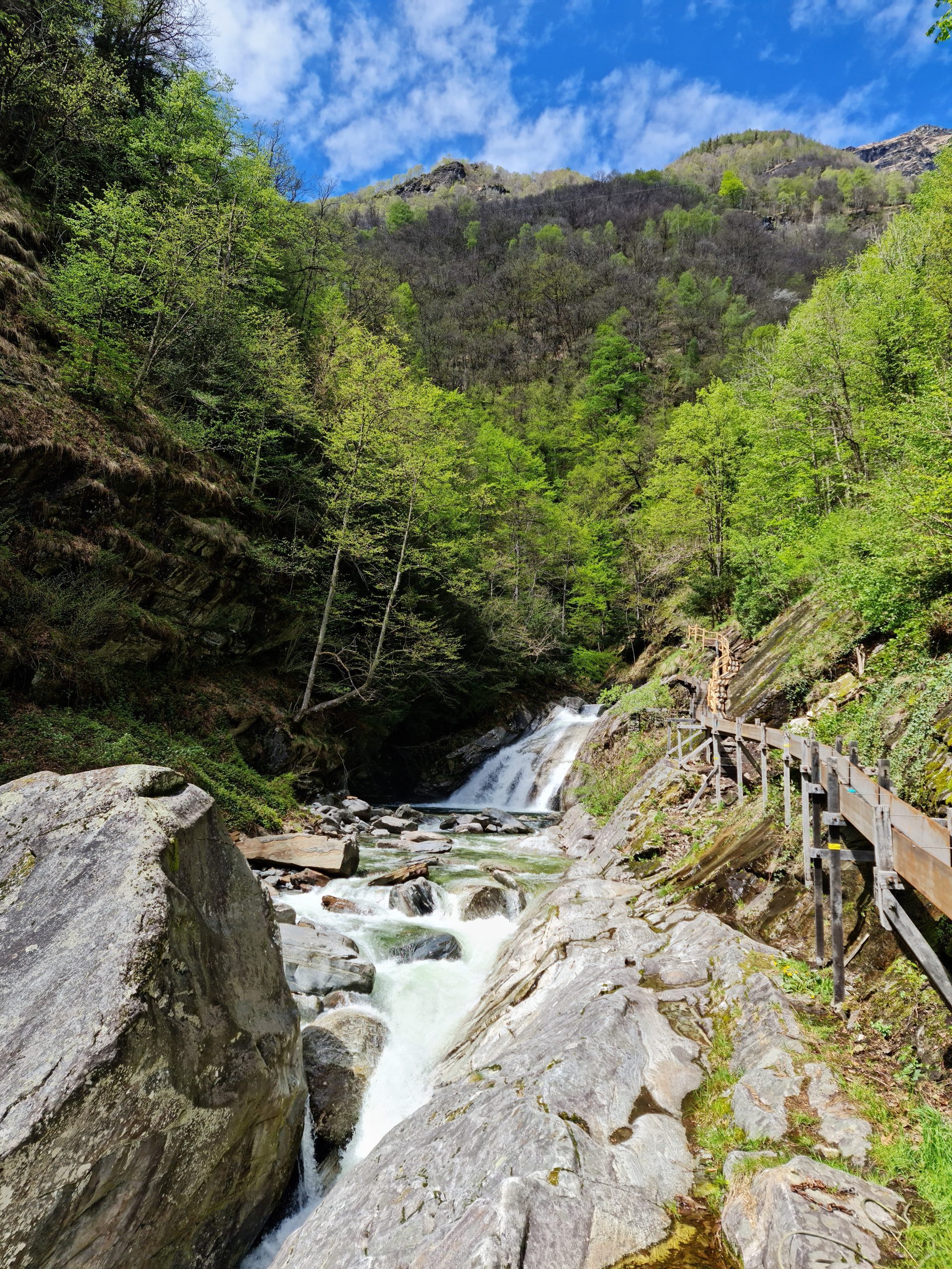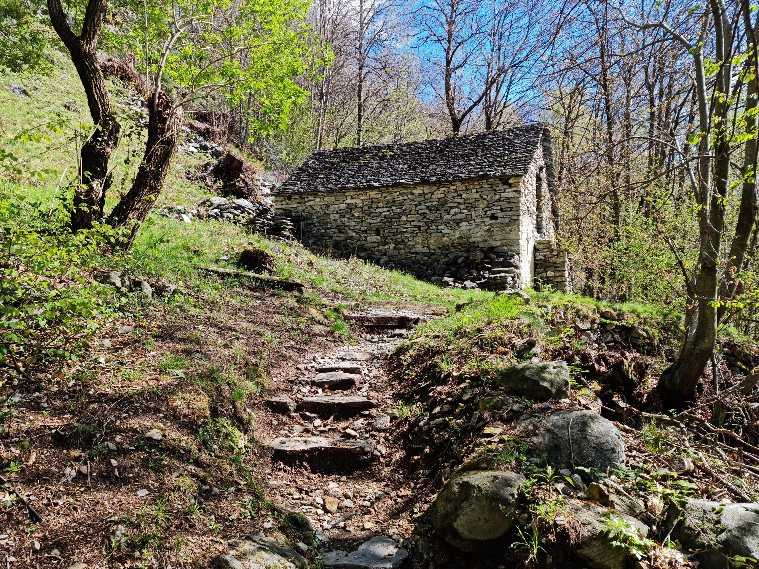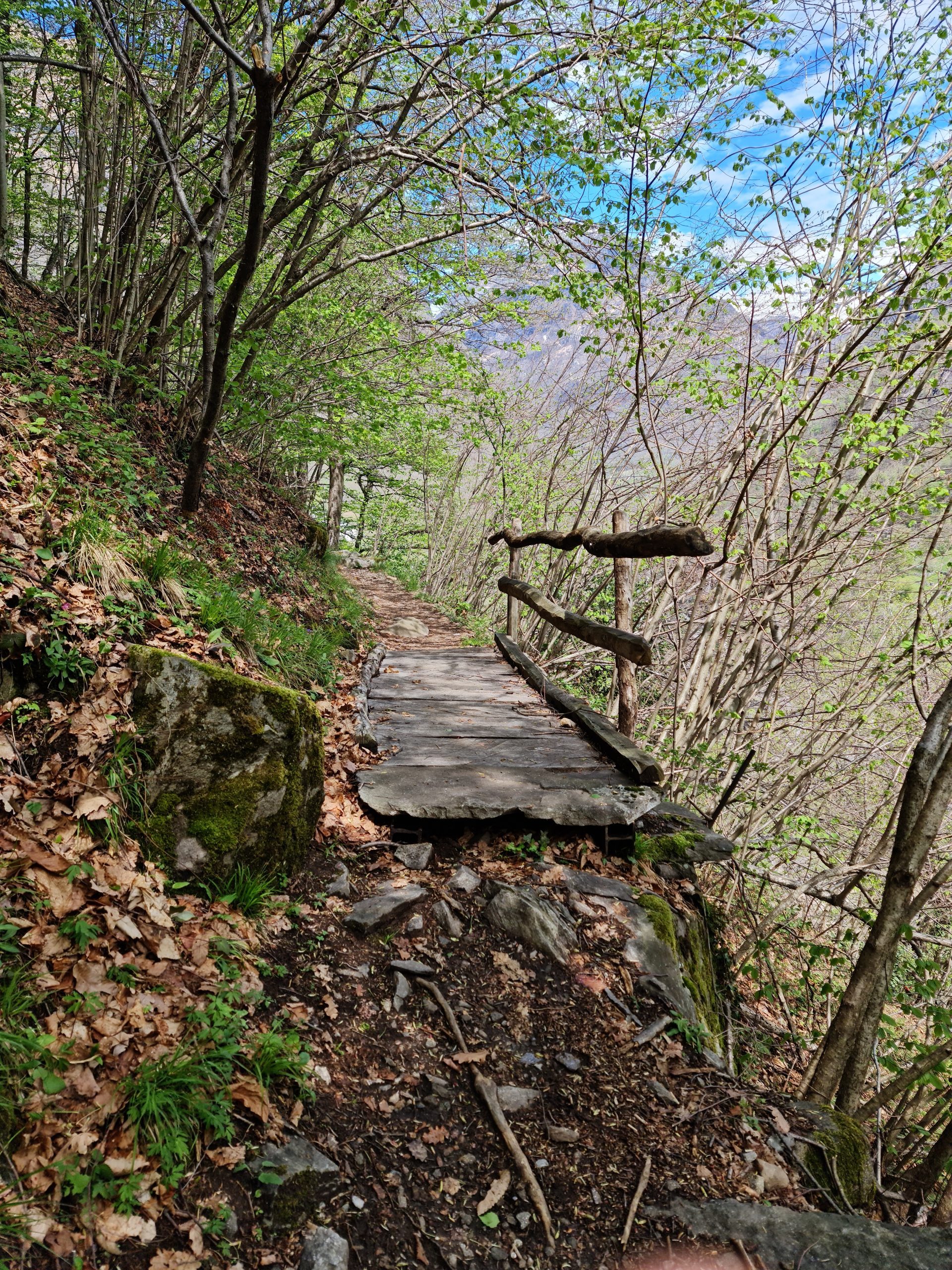 While other hikers are following the yellow signs which start along the tar-road to Lavertezzo, we head off past the church, up ancient paved steps. Past the quaint-looking stone houses of Mergoscia. The unorthodox way. Plotted the night before. We emerge on a path leading through terraced farmland. I’m guessing this was used for fruit trees. I find out later that they used to farm rye and hemp on these terraces. Then the path enters the densely forested hillside. For the first kilometre or so, we climb steadily uphill. Soon we reach the highest point of our hike, and start heading downhill. Moving closer to the river. Mostly on a gentle decline, with the odd steep section thrown in to keep you on your toes.