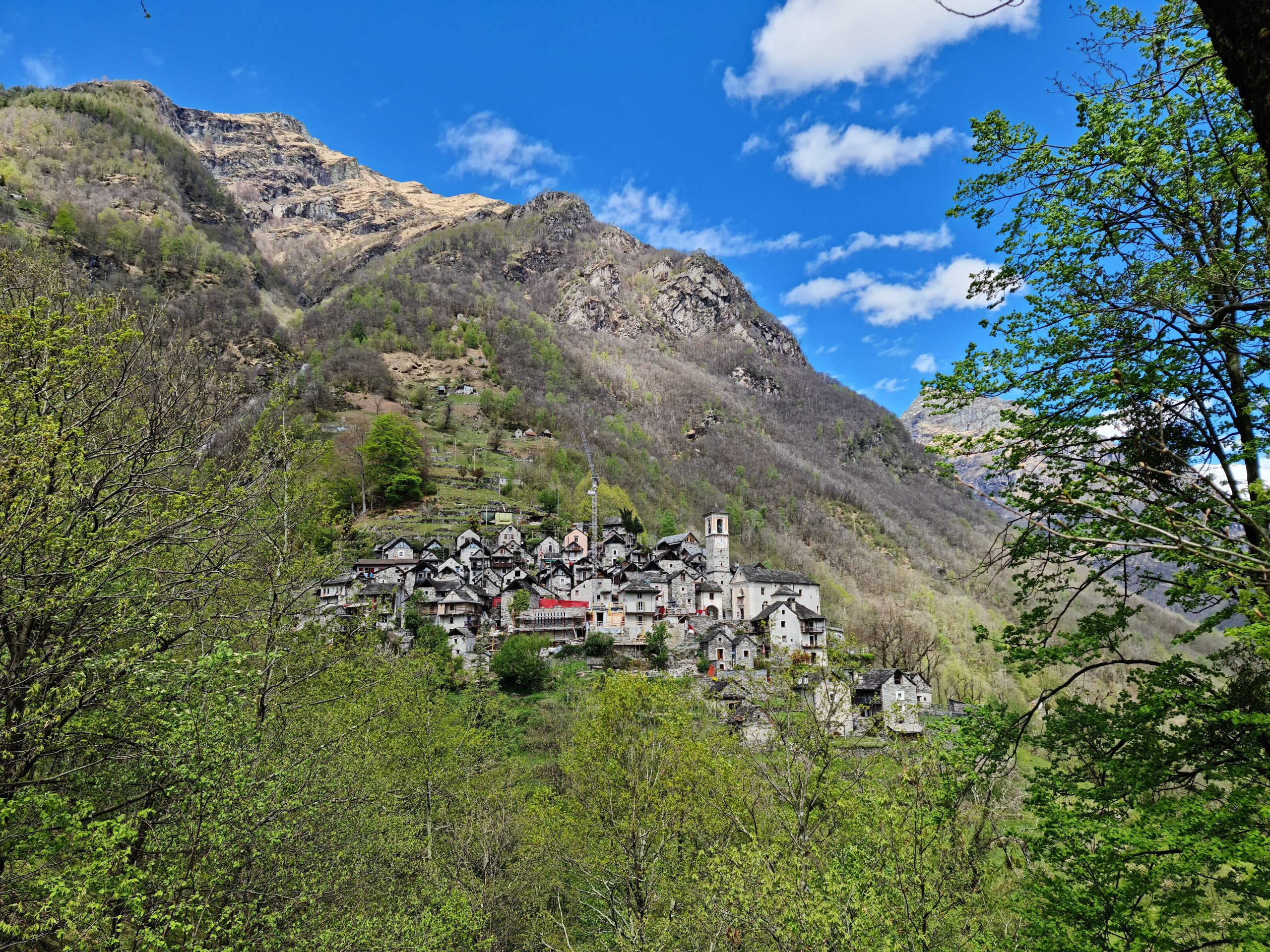 We explore the mill from all angles and take a walk to the start of the water channel that diverts water from the fast-flowing river along a reconstructed channel to drive the mill. Afterwards we brew a cup of coffee and prepare our avocado sandwiches. Then we continue through the tiny village of Corippo, population 2019: nine people; source: Wikipedia – Corippo.